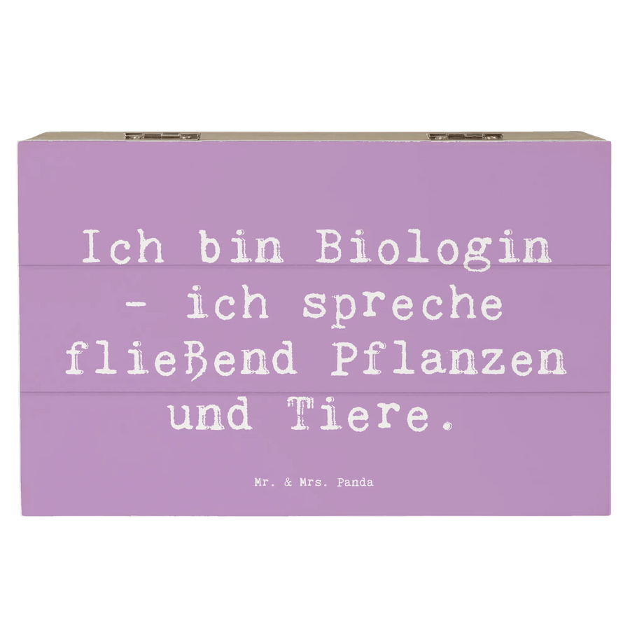 Die Holzkiste "Ich bin Biologin - ich spreche fließend Pflanzen und Tiere" von Mr. & Mrs. Panda ist das perfekte Geschenk für alle Biologinnen in Deinem Leben! Mit ihrem bezaubernden Design und dem witzigen Spruch spricht diese Kiste nicht nur Deine Freunde und Familie an, sondern bietet auch einen praktischen Nutzen.