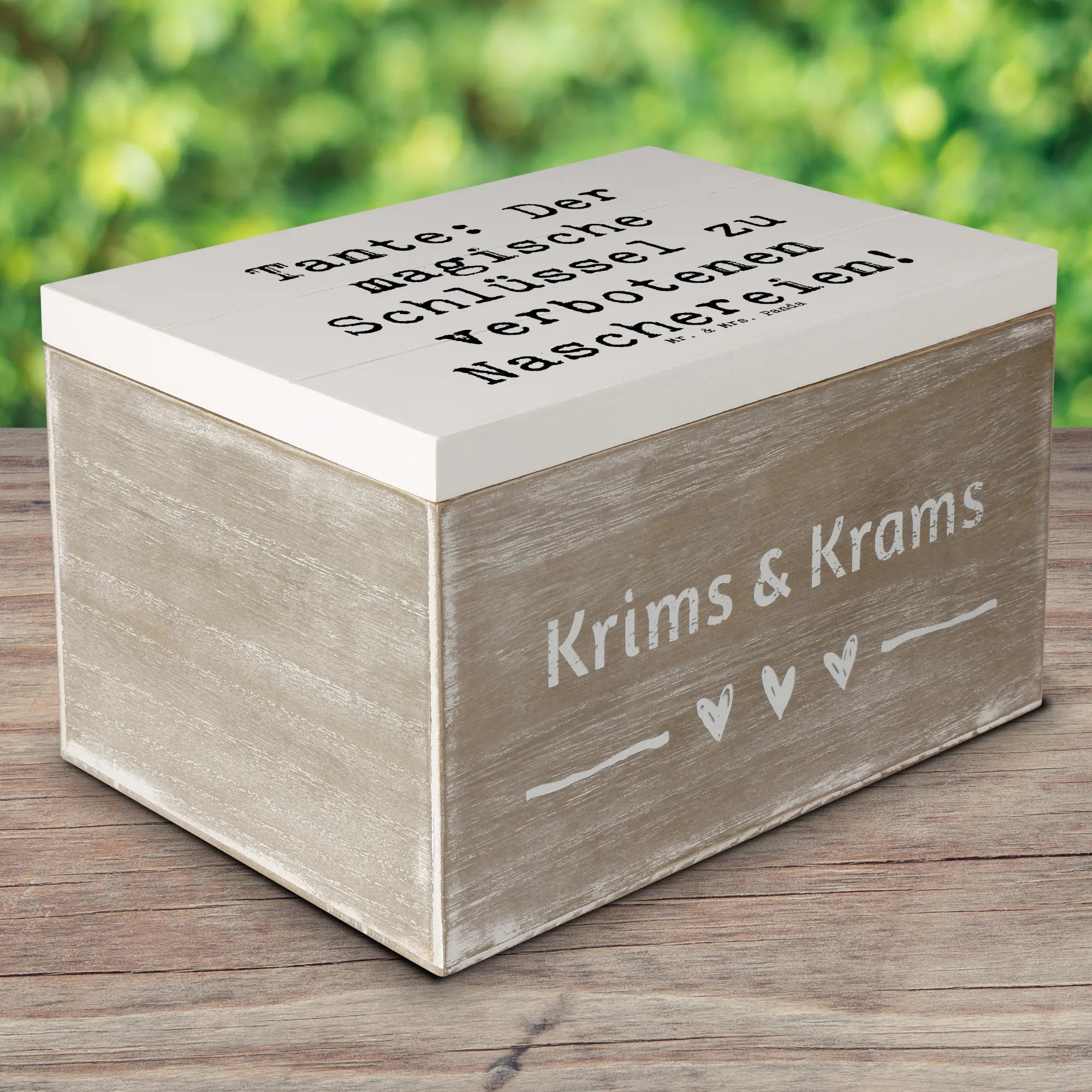 Aber das Besondere an dieser Kiste ist das liebevoll gestaltete Motiv, das mit dem Spruch "Tante: Der magische Schlüssel zu verbotenen Naschereien!" verziert ist. Dieser Spruch fängt die besondere Bindung zwischen Tanten und ihren Nichten oder Neffen perfekt ein. Tanten sind oft mehr als nur Verwandte; sie sind Vertraute, die besondere Momente im Leben teilen und oft die Hüterinnen kleiner Geheimnisse sind.