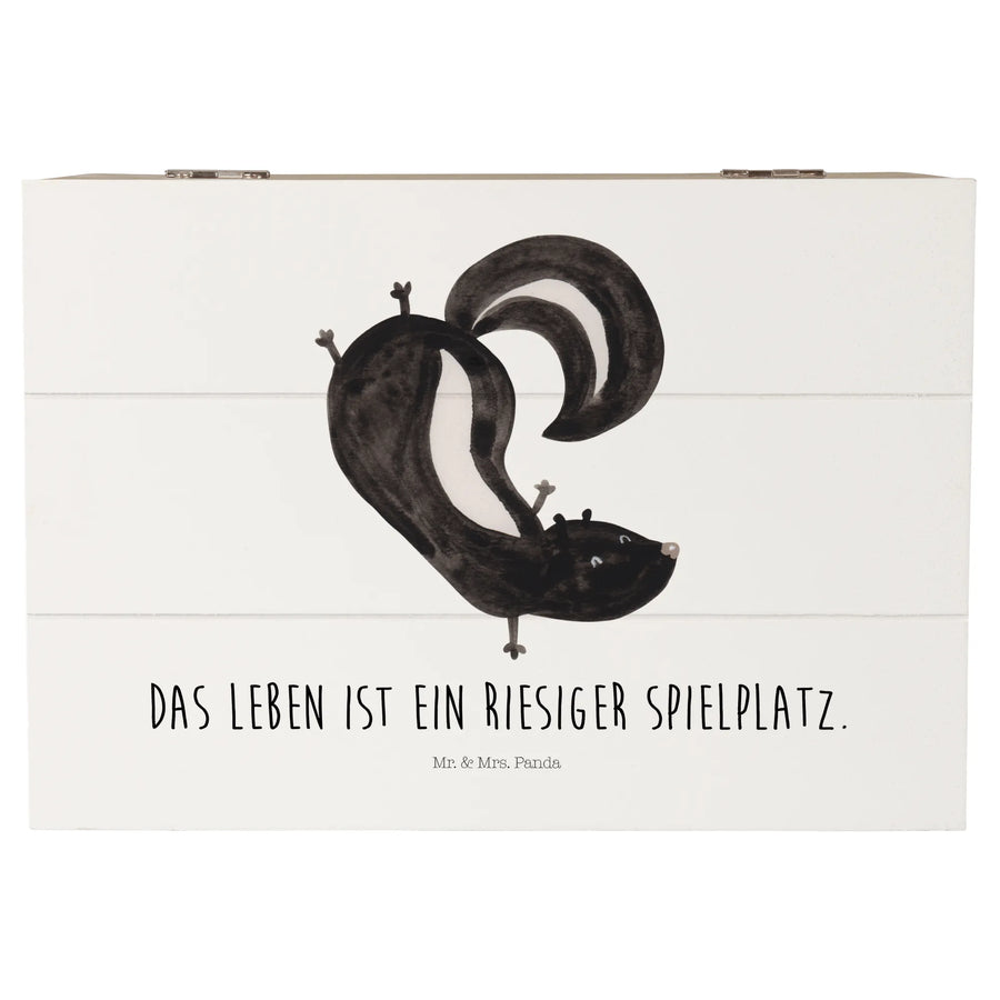 Die wunderschöne Holzkiste mit dem einzigartigen Motiv 'Stinktier Handstand' von Mr. & Mrs. Panda ist das perfekte Geschenk für Jung und Alt. Ob als Schatzkiste für die eigenen vier Wände oder als besondere Erinnerungskiste für besondere Anlässe – diese Box ist vielfältig verwendbar.