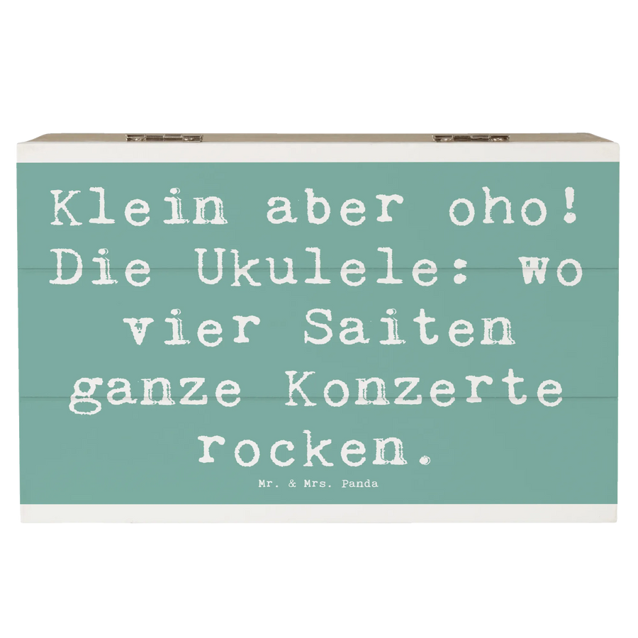 Entdecke die zauberhafte Holzkiste von Mr. & Mrs. Panda im Design einer Ukulele, der perfekte Begleiter für alle Musikliebhaber! Diese wunderschöne Kiste, die mit dem Spruch 'Klein aber oho! Die Ukulele: wo vier Saiten ganze Konzerte rocken.' geschmückt ist, bietet nicht nur einen praktischen Aufbewahrungsort für Deine wertvollen Erinnerungen, sondern auch ein Stück Lebensfreude, das an sonnige Tage in Hawaii erinnert.
