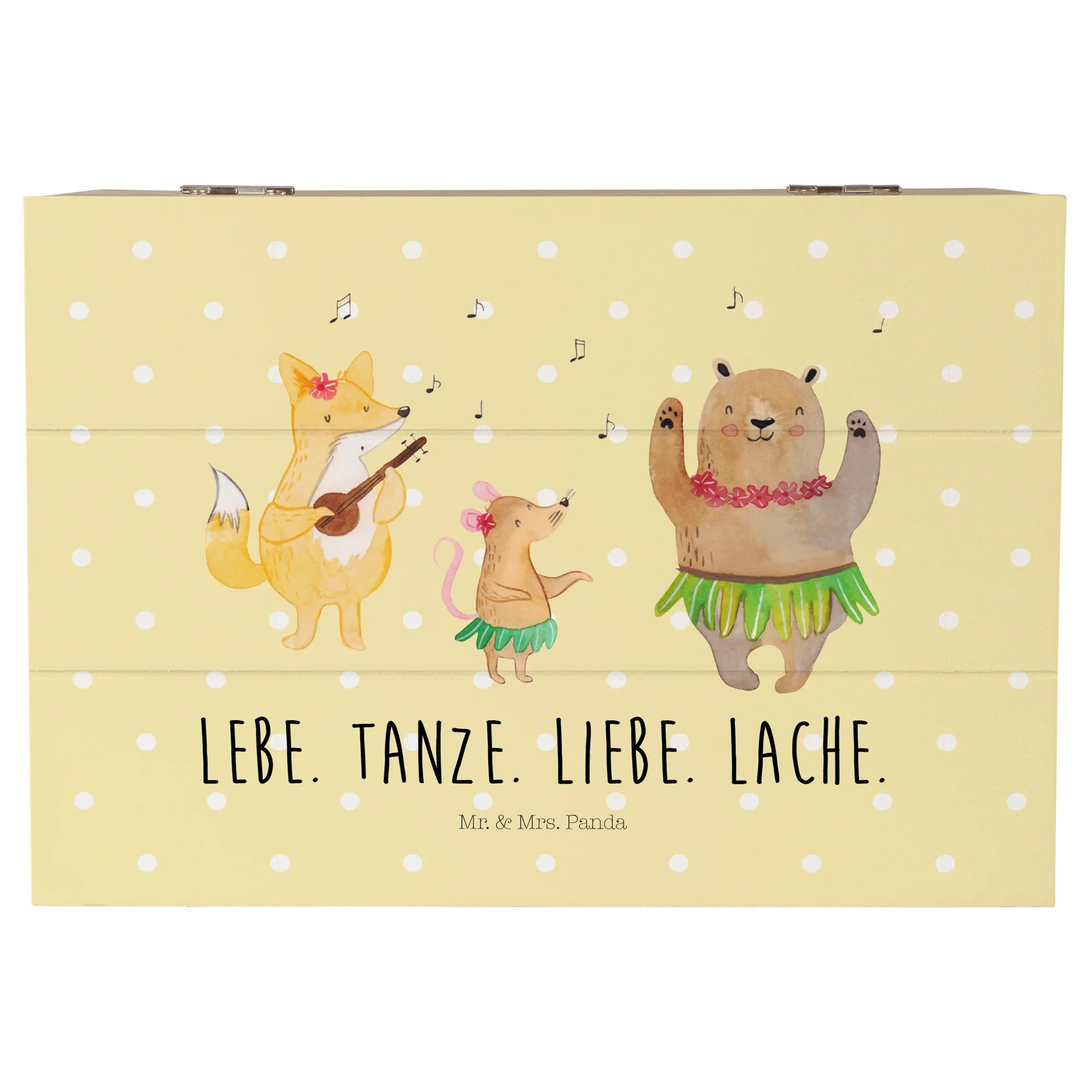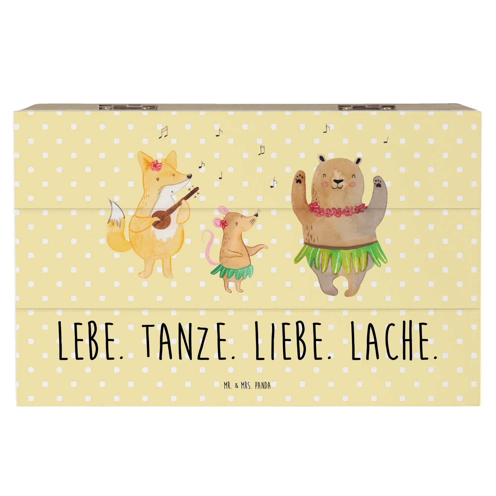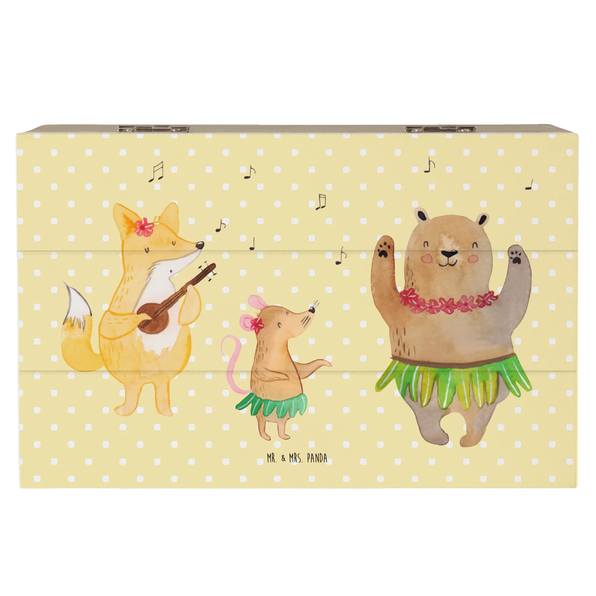 Die Holzkiste Waldtiere Aloha von Mr. & Mrs. Panda bringt Urlaubsstimmung ins Kinderzimmer und ins Zuhause. Auf einem pastellgelben Hintergrund tanzen süße Waldtiere in Hula-Röckchen – ein fröhlicher Print, der gute Laune verbreitet und perfekt als Geschenkbox Holz oder Erinnerungskiste fungiert.