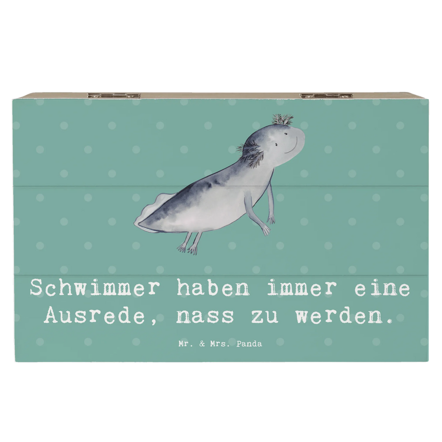 Die wunderschöne Holzkiste von Mr. & Mrs. Panda ist das perfekte Geschenk für alle Schwimmbegeisterten! Mit dem liebevollen Spruch "Schwimmer haben immer eine Ausrede, nass zu werden." bringst Du ein Lächeln auf die Gesichter von Freunden und Familie, die das Wasser lieben.