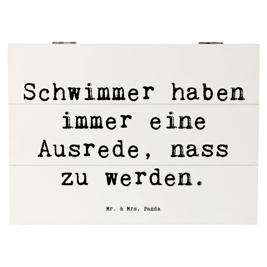 Entdecke die wunderschöne Holzkiste von Mr. & Mrs. Panda, bedruckt mit dem liebevollen Motto "Schwimmer haben immer eine Ausrede, nass zu werden." Diese spezielle Kiste aus stabiler Premium Hartfaser ist nicht nur ein herrlicher Blickfang, sondern auch eine praktische Lösung zur Aufbewahrung aller deiner wertvollen Schätze.