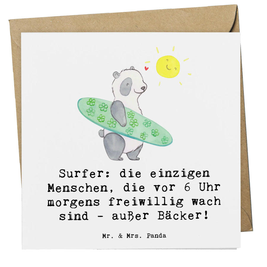 Die Karte ist auf hochwertigem 300 Gramm Karton gedruckt und hat eine hochglänzende Vorderseite, die das süße Surfer-Motiv mit dem witzigen Spruch 'Surfer: die einzigen Menschen, die vor 6 Uhr morgens freiwillig wach sind - außer Bäcker!' perfekt zur Geltung bringt. Sie misst 140 mm x 140 mm und kommt mit einem edlen Umschlag, sodass du sie direkt verschenken kannst.