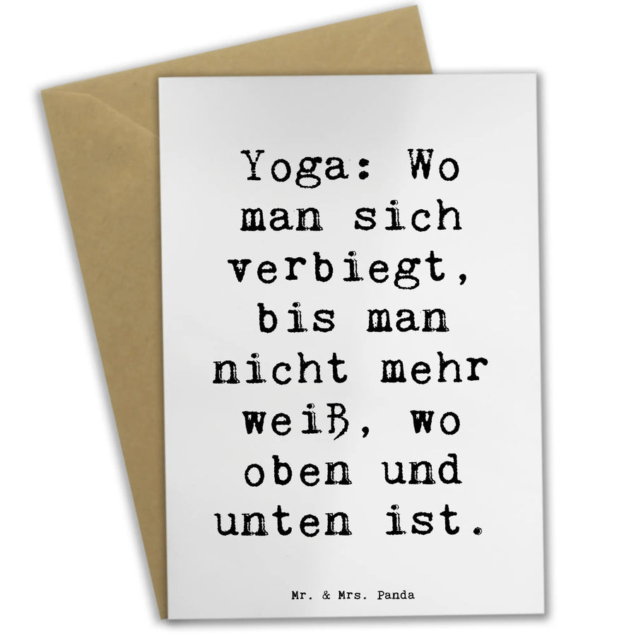 Yoga ist nicht nur eine Sportart, sondern eine Lebenseinstellung, die Körper und Geist vereint. Unsere wunderschöne Grußkarte von Mr. & Mrs. Panda mit dem Spruch "Yoga: Wo man sich verbiegt, bis man nicht mehr weiß, wo oben und unten ist." ist das perfekte Geschenk für alle, die ihre Liebe zum Yoga ausdrücken möchten.