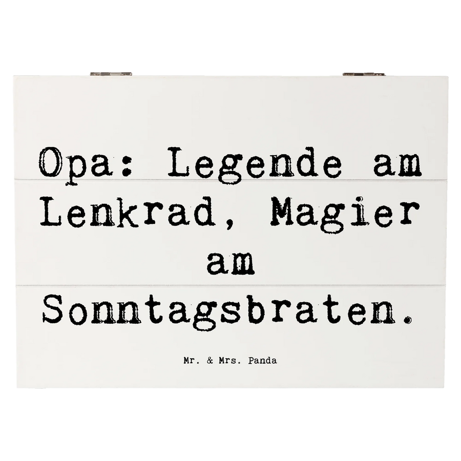 Die wunderschöne Holzkiste von Mr. & Mrs. Panda, bedruckt mit dem liebevollen Spruch 'Opa: Legende am Lenkrad, Magier am Sonntagsbraten', ist das perfekte Geschenk für all die stolzen Großväter, die in der Familie eine ganz besondere Rolle spielen. Diese robuste Erinnerungskiste ist nicht nur ein wahrer Eyecatcher, sondern bietet auch einen idealen Aufbewahrungsort für wertvolle Schätze und Erinnerungen.