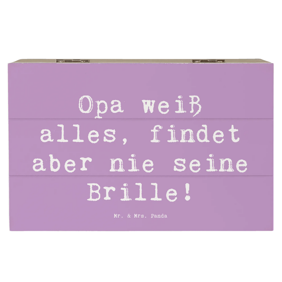 Suchst Du das perfekte Geschenk für Deinen Opa? Dann ist die wunderschöne Holzkiste von Mr. & Mrs. Panda genau das Richtige! Mit dem süßen Spruch "Opa weiß alles, findet aber nie seine Brille!" wird diese Kiste nicht nur zum Aufbewahrungsort für die kostbarsten Erinnerungen, sondern auch zum echten Hingucker, der ein Lächeln auf die Lippen zaubert.