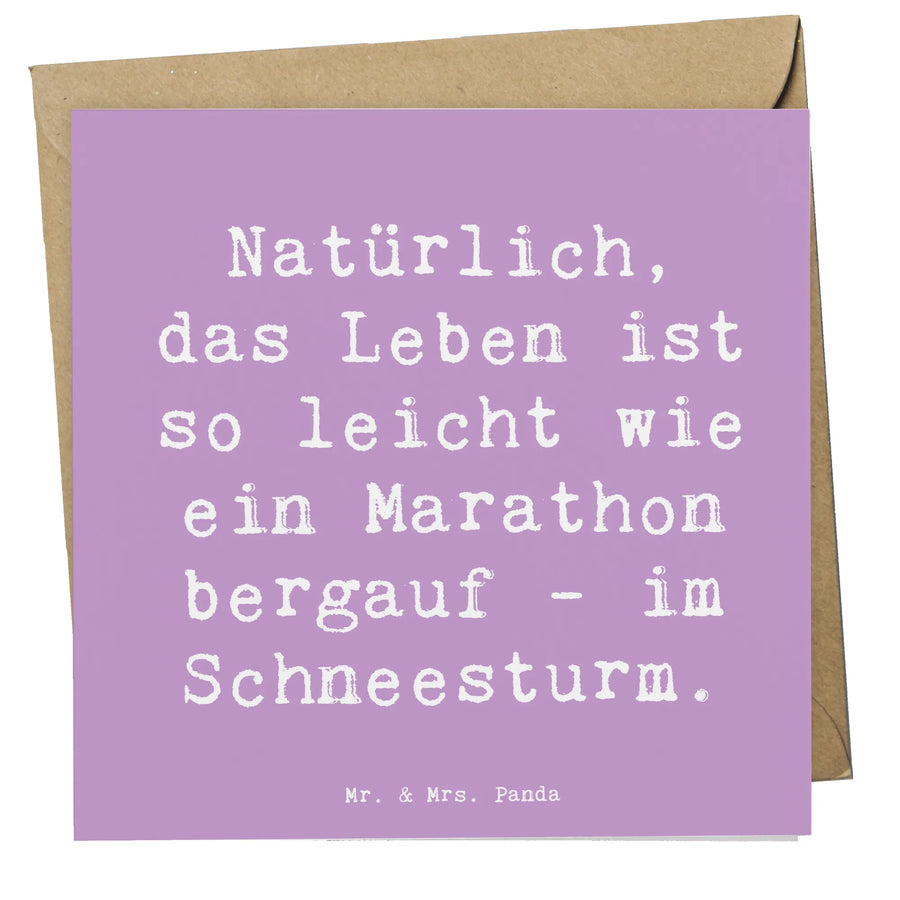 Wenn Du nach einer Möglichkeit suchst, jemandem in seinem Leben ein Lächeln ins Gesicht zu zaubern, ob anlässlich eines Geburtstags, einer Hochzeit, einer Verabschiedung oder einfach nur zur Aufmunterung, dann ist diese Karte genau das Richtige. Auf der Vorderseite findest Du den inspirierenden Spruch: "Natürlich, das Leben ist so leicht wie ein Marathon bergauf - im Schneesturm." Ein Zitat, das zum Nachdenken anregt und durch seine Leichtigkeit besticht.