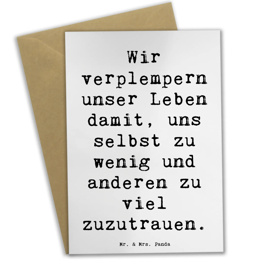 Die Grußkarte "Leichtigkeit" von Mr. & Mrs. Panda ist der perfekte Begleiter für jeden besonderen Moment in Deinem Leben. Ob für Geburtstage, Hochzeiten oder einfach nur zur Übermittlung einer Glückwunschbotschaft – diese einzigartige Klappkarte zaubert jedem Empfänger ein Lächeln ins Gesicht! Mit ihrem bezaubernden Motiv und dem inspirierenden Spruch, "Wir verplempern unser Leben damit, uns selbst zu wenig und anderen zu viel zuzutrauen", vermittelt sie ein Gefühl von Leichtigkeit und Positivität.