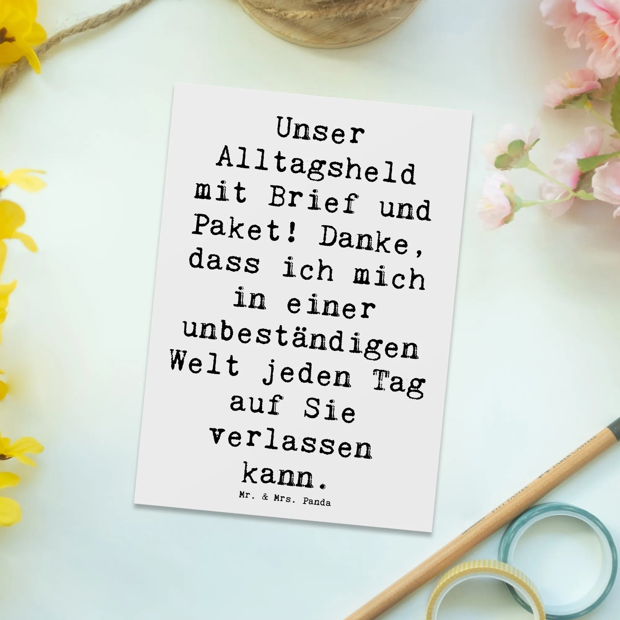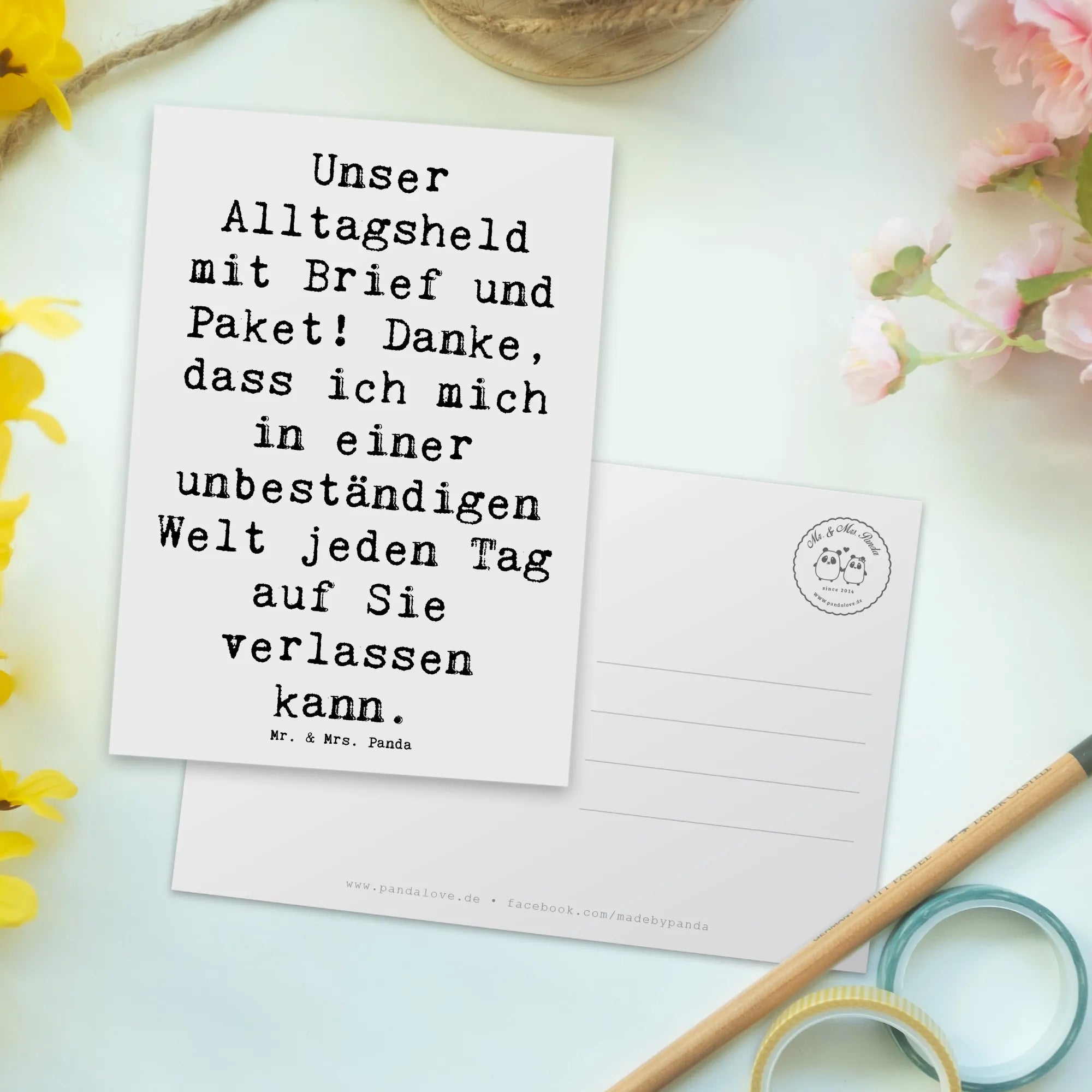 Die einzigartige Postkarte von Mr. & Mrs. Panda mit dem niedlichen Motif 'Briefträger' ist das perfekte Geschenk, um Deine Dankbarkeit auf eine liebevolle Art und Weise auszudrücken. In einer Welt voller Unsicherheiten ist es wichtig, Menschen zu schätzen, auf die man sich verlassen kann. Diese Karte mit dem klingenden Slogan 'Unser Alltagsheld mit Brief und Paket! Danke, dass ich mich in einer unbeständigen Welt jeden Tag auf Sie verlassen kann.' bringt genau das perfekte Gefühl rüber.