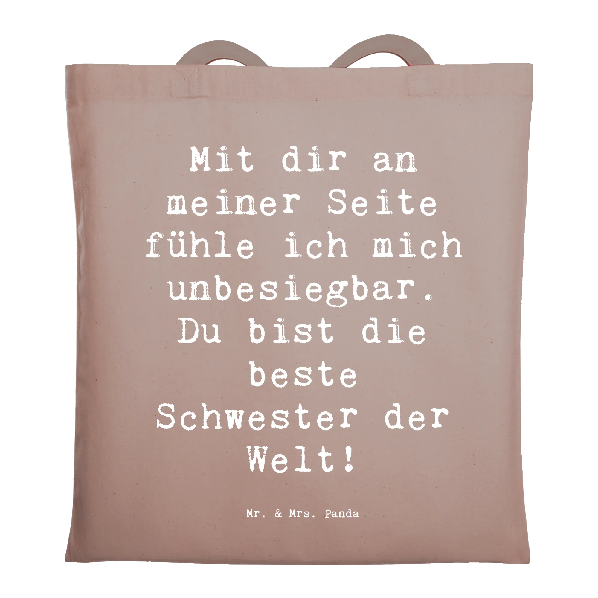 Das besondere Motto auf der Tasche lautet: "Mit dir an meiner Seite fühle ich mich unbesiegbar. Du bist die beste Schwester der Welt!" – ein persönlicher und herzlicher Spruch, der direkt von Herzen kommt. Perfekt für Anlässe wie Geburtstage, Jahrestage oder einfach als spontanes Dankeschön – mit dieser Tragetasche bringst du ein Lächeln auf das Gesicht deiner Schwester.