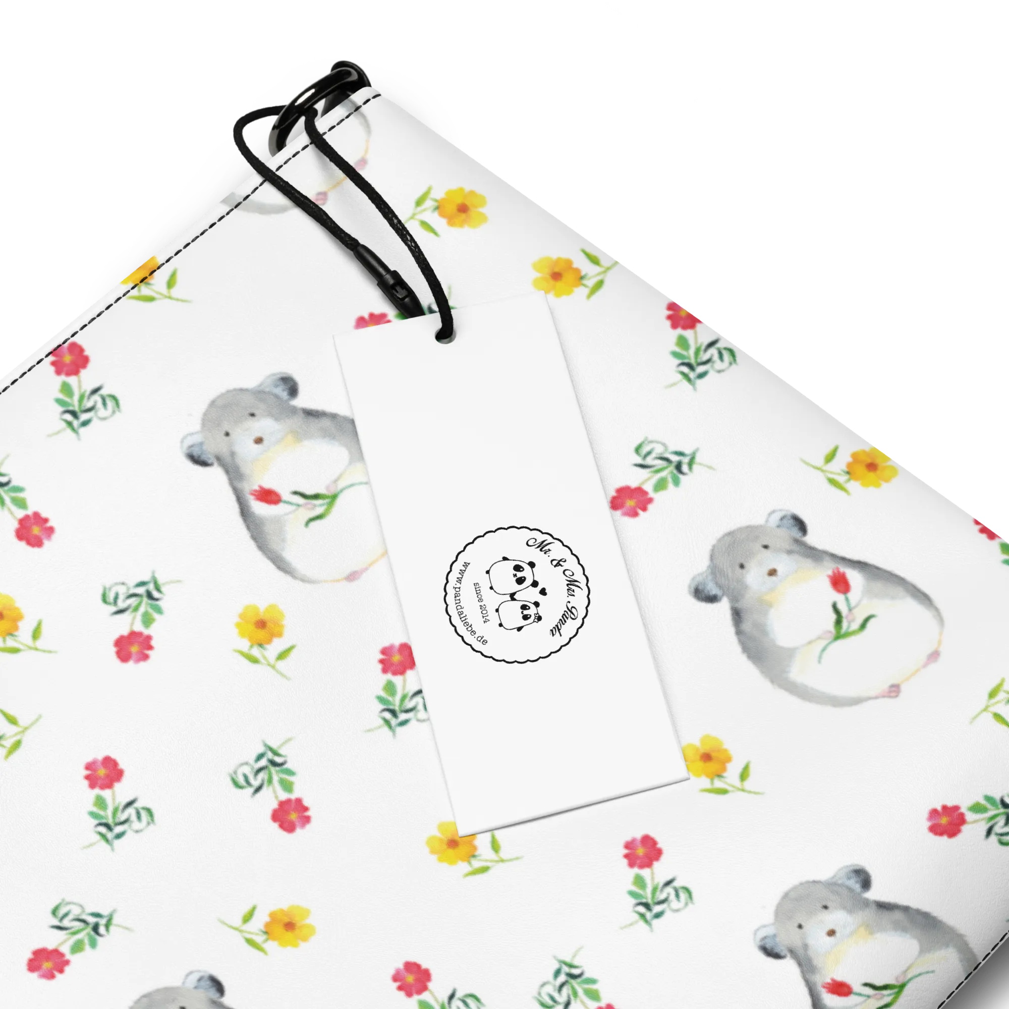 Diese bezaubernde Handtasche vereint niedliches Design und alltagspraktische Funktion. Das liebevoll von Mrs. Panda gezeichnete Chinchilla hält eine Blume und schaut dich mit großen Augen an – ein kleiner Trostspender für Tage mit Liebeskummer, stressigen Büroalltag oder einfach, wenn du dir selbst eine Freude machen willst. Der aufgedruckte Spruch „Und bei dem ganzen Chaos im Alltag, vergiss niemals das Glücklichsein.“ begleitet dich dezent und dennoch präsent.
