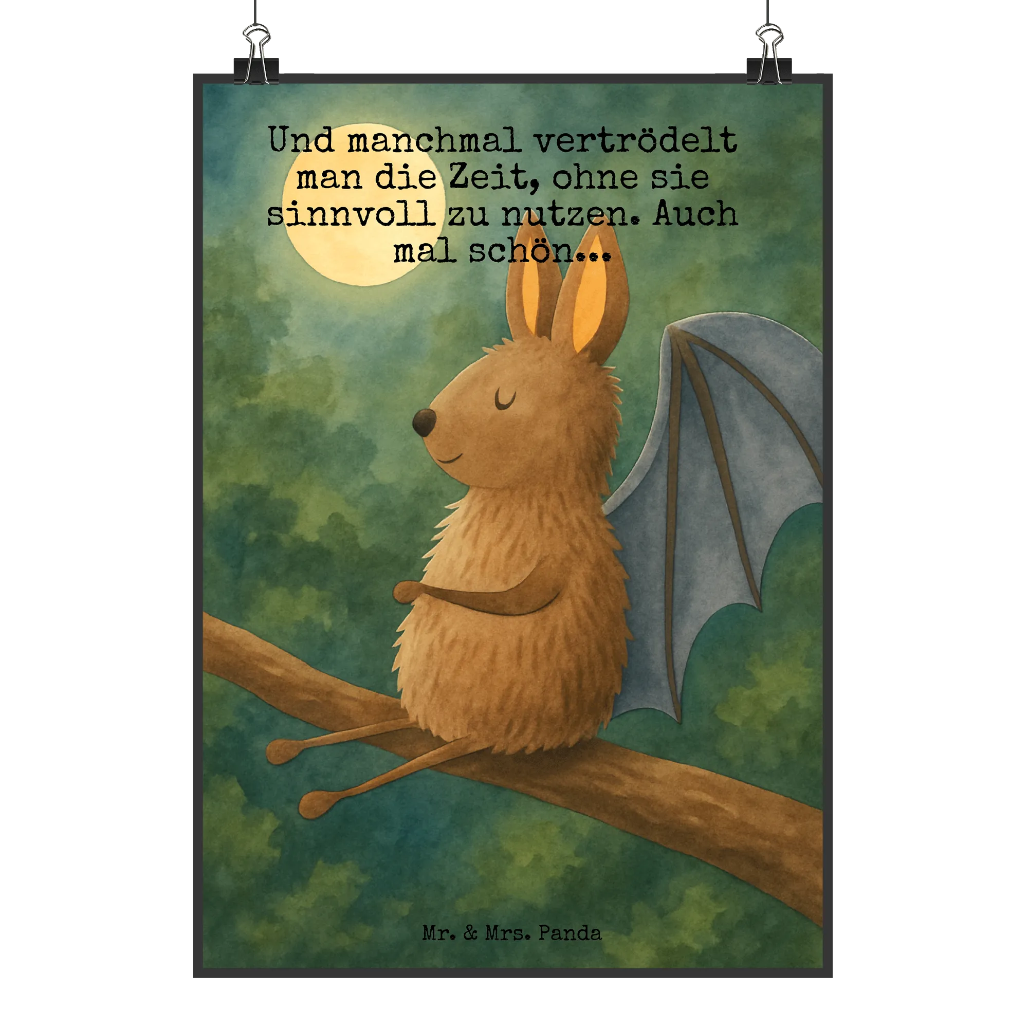 Vergiss die Hektik des Alltags und lass dich von unserer Fledermaus in eine Welt der Entspannung entführen. Dargestellt in einer Pose der Ruhe, erinnert uns dieses Motiv daran, wie wichtig es ist, auch mal innezuhalten. Der beigefügte Spruch „Und manchmal vertrödelt man die Zeit, ohne sie sinnvoll zu nutzen. Auch mal schön...“, unterstützt die Botschaft des Bildes auf wundervolle Weise. Er spricht von der Schönheit des Moments, in dem man sich erlaubt, einfach zu sein. Dieses Motiv von Mr. & Mrs. Panda lädt dich ein, dein Leben auch mal langsamer anzugehen und die kleinen Freuden zu genießen, die ein Moment der Ruhe birgt.