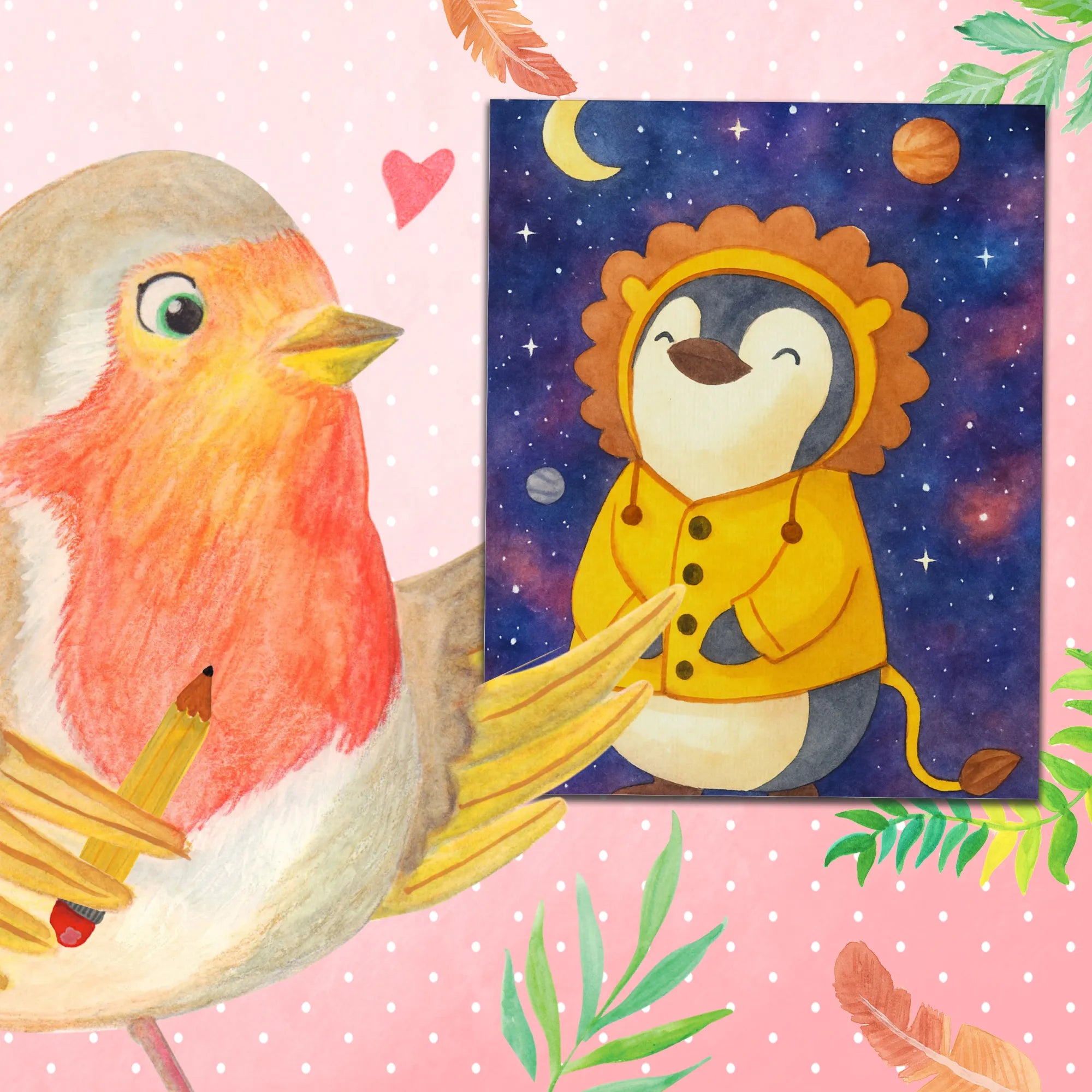 Hier präsentiere ich dir einen einzigartigen Löwen-Pinguin, der in seinem süßen Kostüm strahlt wie die Sonne. Mit einem Lächeln auf den Lippen und verschlossenen Augen scheint er die Welt um sich herum vollkommen zu genießen. Sein kleine Herzchen schwebt über ihm und symbolisiert die Liebe und Freude, die alles umgibt. Der Pinguin verkörpert die leidenschaftliche Natur des Sternzeichens Löwe und erinnert uns daran, mutig und glücklich zu sein, egal was die Welt uns bringt. Ein perfektes Geburtstagsgeschenk, um deine Freunde oder Familie daran zu erinnern, wie besonders sie sind! Lass dich von dieser fröhlichen Figur inspirieren, das Leben zu feiern und die verschiedenen Facetten des Löwen zu umarmen - vom selbstbewussten Charisma bis zu der herzlichen Fürsorglichkeit, die das Sternzeichen Löwe ausmacht.