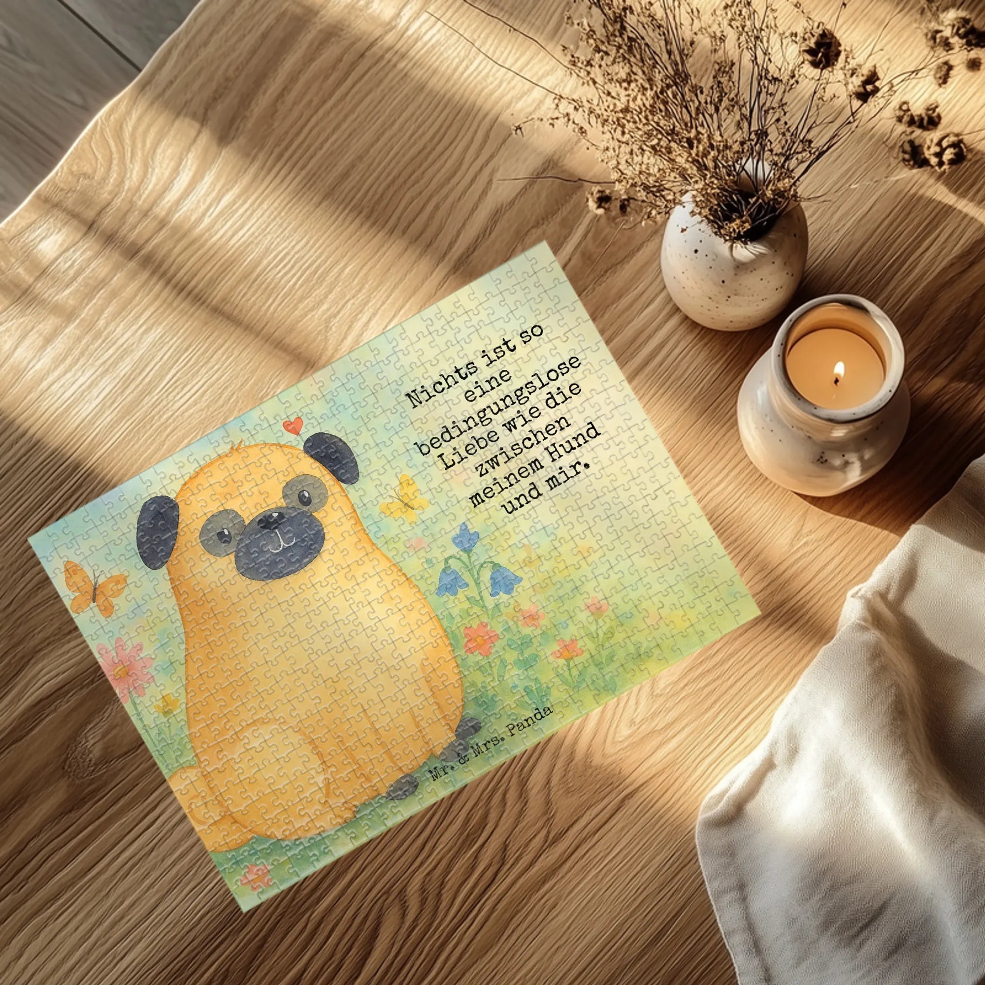 Willkommen im zauberhaften Universum der Hunde, festgehalten in der einzigartigen Kollektion von Mr. & Mrs. Panda. Voller Liebe und Freude präsentieren wir Produkte, die jedes Hundehalterherz höherschlagen lassen. Unsere Kollektion umfasst eine Vielzahl von Artikeln, die nicht nur praktisch sind, sondern auch tiefgründige Emotionen ausdrücken. Die Palette reicht von geschmackvollen Dekorationsartikeln bis zu nützlichen Alltagsbegleitern, alle geziert mit charmanten Hundemotiven und inspirierenden Sprüchen. Als Highlight unserer Sammlung dienen die handgezeichneten Aquarelle von Mrs. Panda, die jedem Produkt eine persönliche und künstlerische Note verleihen. Schenke dir selbst oder einem Hundebesitzer in deinem Leben ein Stück Freude und Wärme mit unseren sorgfältig ausgewählten Stücken, die die Liebe zwischen Mensch und Haustier feiern.