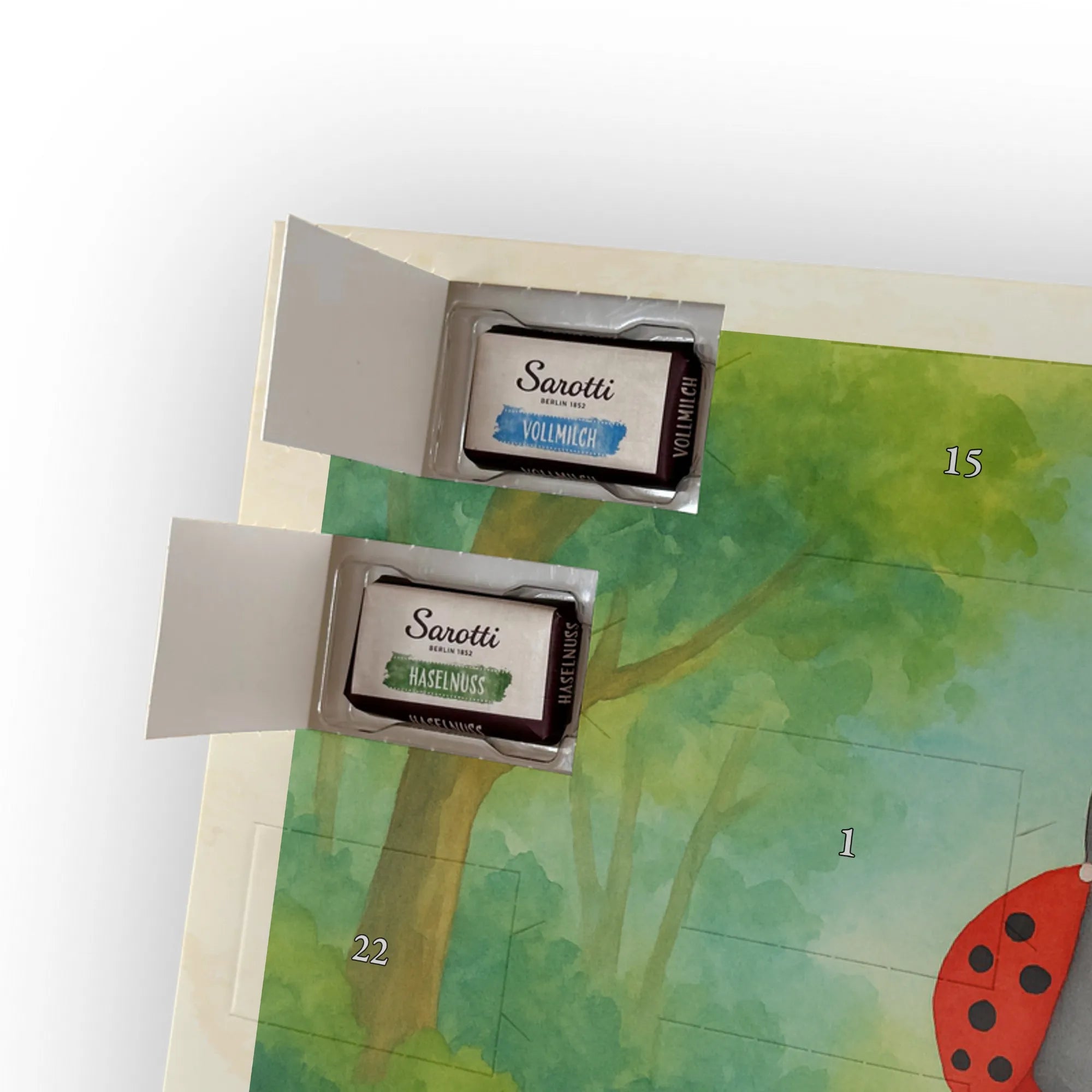 🐼 Adventskalender mit Schokolade, liebevoll bedruckt, seidenmatt veredelt.