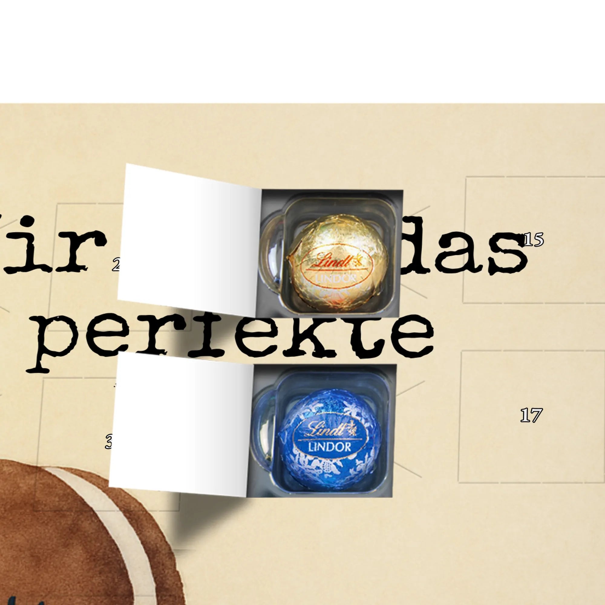 Unser Adventskalender Schokolade von Mr. & Mrs. Panda vereint niedliches Design mit leckerer Überraschung. Bedruckt mit wunderschönen Motiven & Sprüchen, nicht personalisierbar, ist er ein unkompliziertes Geschenk, das Freude macht. Die brillante Druckqualität mit seidenmatter Oberflächenveredelung verleiht dem Kalender einen hochwertigen Look, ergänzt durch bedruckte Seitenflächen für ein rundum stimmiges Design. Maße: 233 mm x 178 mm x 24 mm. Besonderheit: kann aufgehängt oder aufgestellt werden und passt so perfekt in jede Deko. Gefüllt mit Lindt Lindor: 24 einzeln verpackte Markenschokoladen Kugeln in Vollmilch, Feinherb und Weiße Schokolade sorgen für abwechslungsreichen Genuss. Zutaten: Zucker, pflanzliches Fett (Kokosnuss, Palmkern), Kakaobutter, Vollmilchpulver, Kakaomasse, Milchzucker, Magermilchpulver, Butterreinfett, Emulgator (Sojalecithin), Gerstenmalzextrakt, Aromen. Besondere Hinweise: Kann Haselnüsse und Mandeln enthalten. Hol dir diese süße Vorfreude oder verschenke sie – Mr. & Mrs. Panda wünschen dir eine gemütliche Adventszeit!