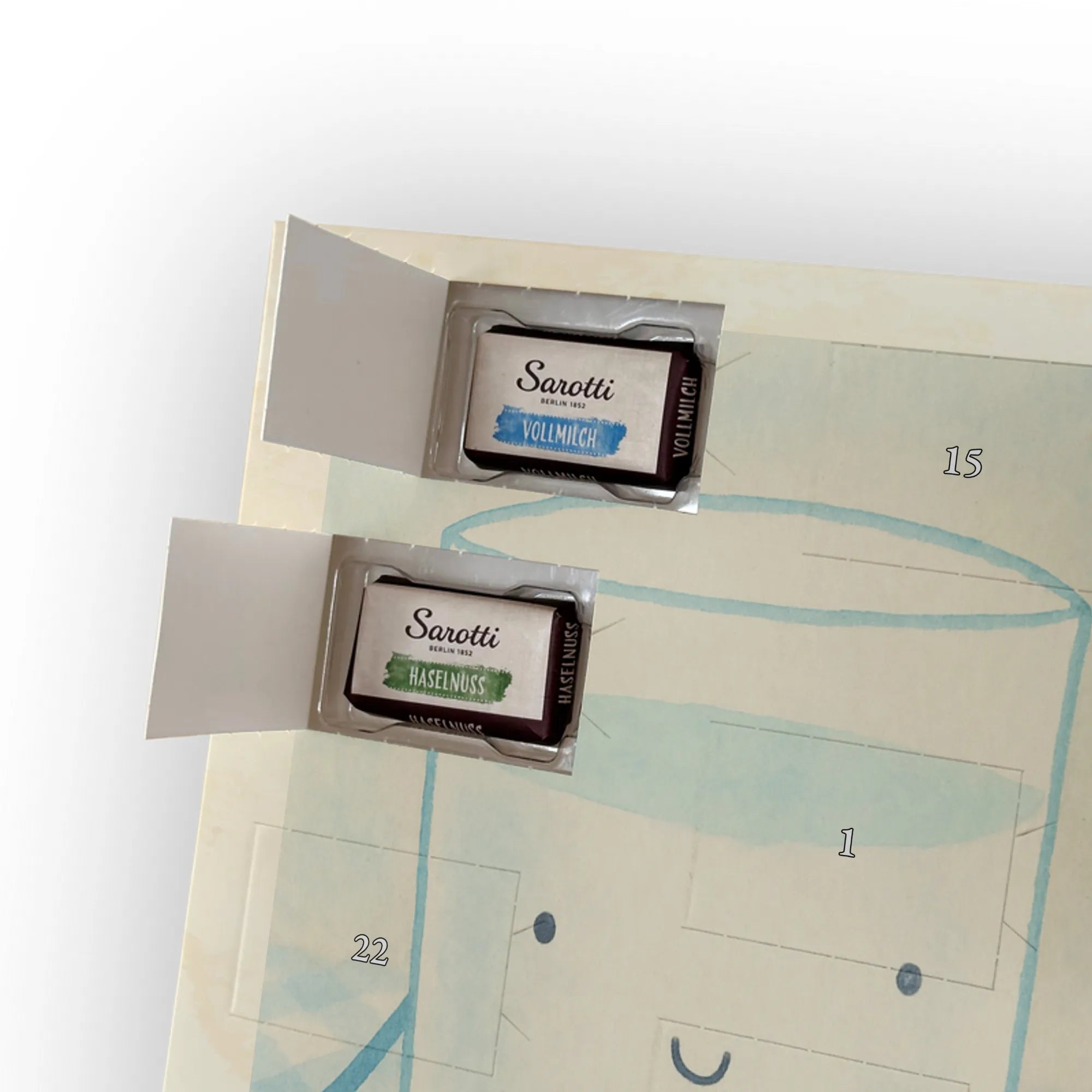 🐼 SCHOKOLADEN-ADVENTSKALENDER: Edler, seidenmatter Druck mit liebevollen Illustrationen.