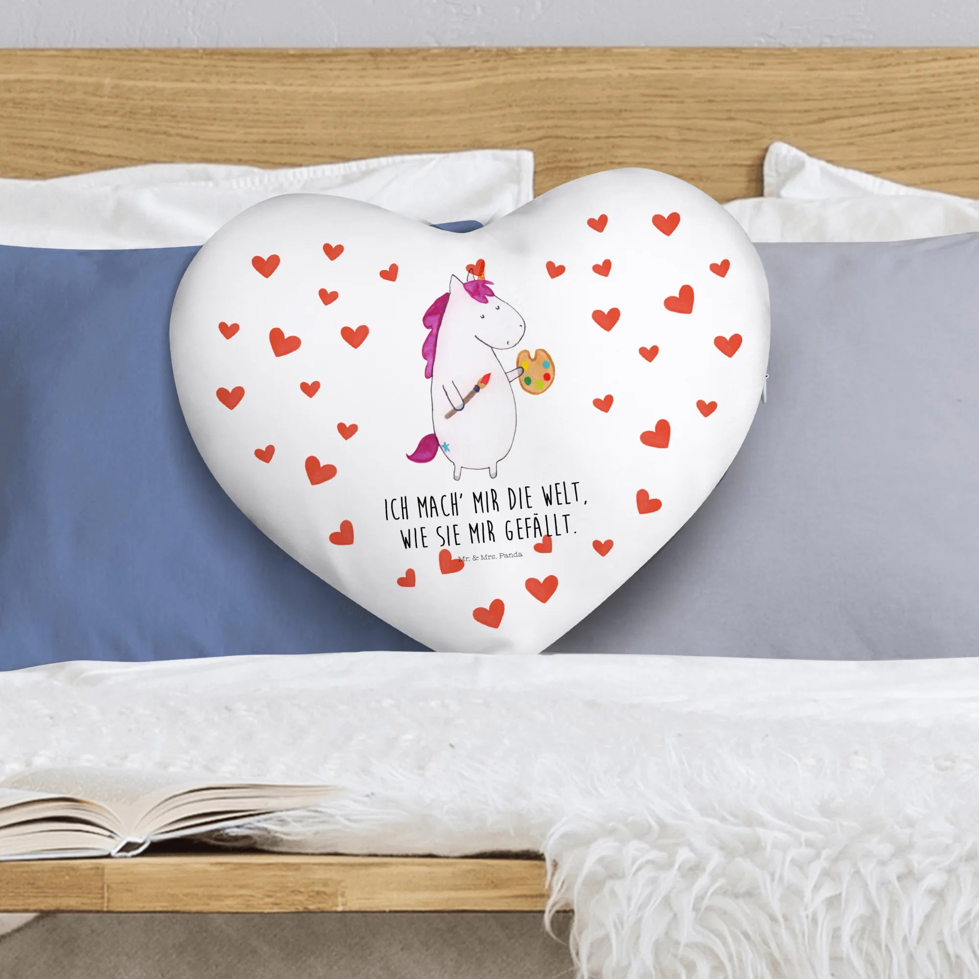 Das Herzkissen Einhorn Künstler von Mr. & Mrs. Panda ist das ideale Geschenk für alle, die die bunte und kreative Welt der Einhörner lieben. Mit einem charmanten Motiv eines Einhorns, das an einer Staffelei malt, und dem herzlichen Spruch "Ich mach' mir die Welt, wie sie mir gefällt", bringt dieses Kissen Freude und Inspiration in jedes Zuhause.