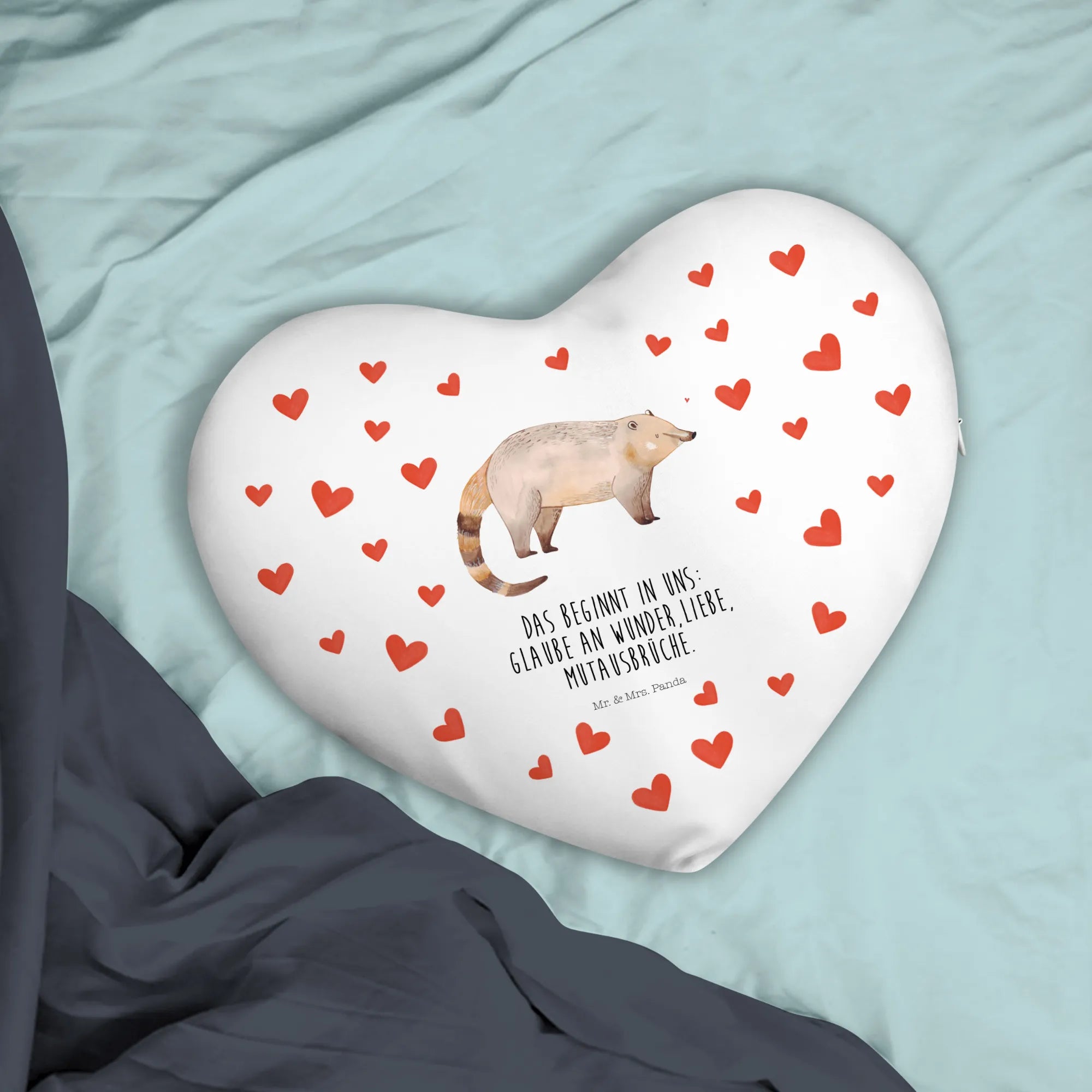 Das Herzkissen mit dem süßen Nasenbär-Motiv aus der Small World Kollektion von Mr. & Mrs. Panda ist das perfekte Geschenk, um gute Laune zu verbreiten. Mit seinen sanften Brauntönen und der freundlichen Gesichtszeichnung bringt dieser Rüsselbär sofort ein Lächeln auf jedes Gesicht.