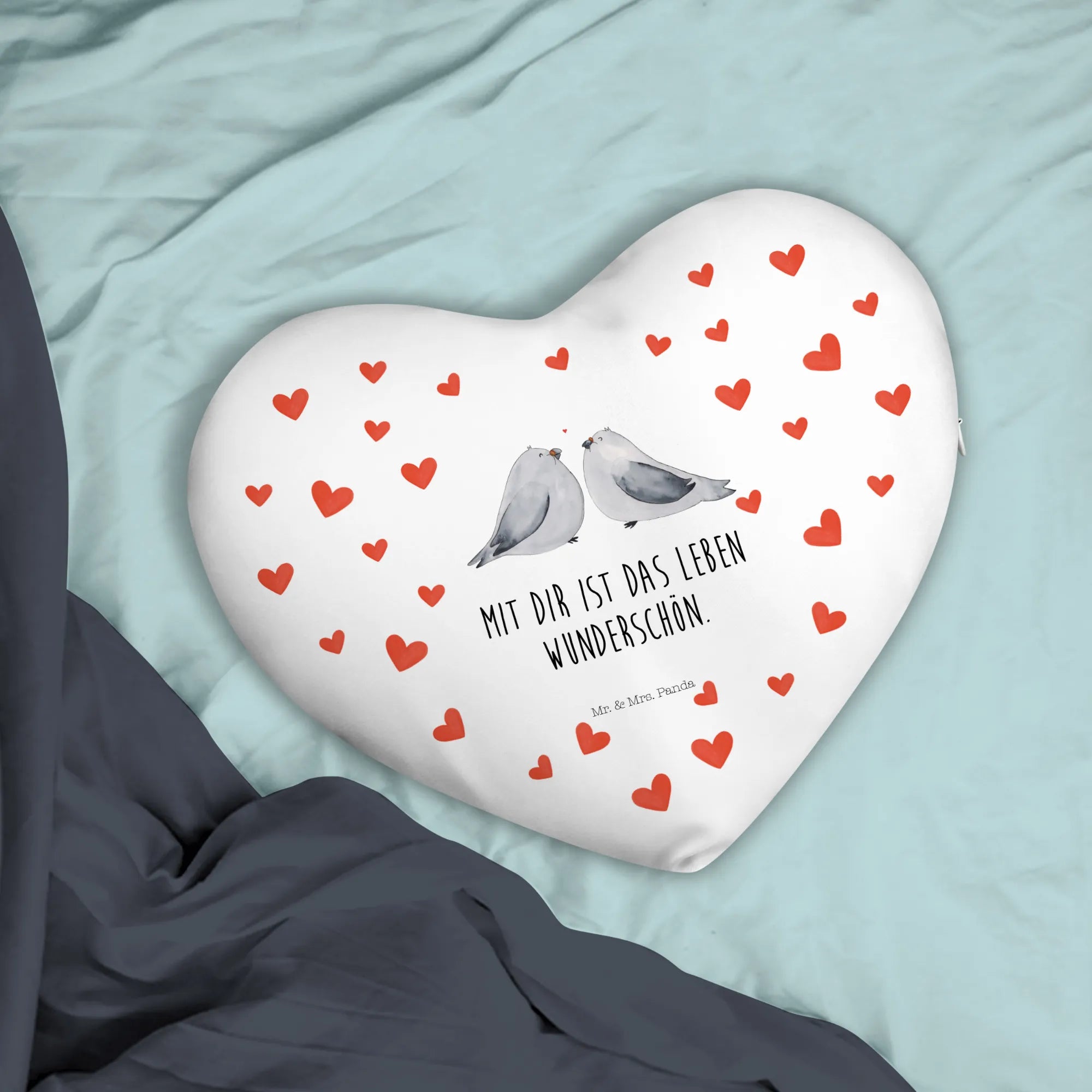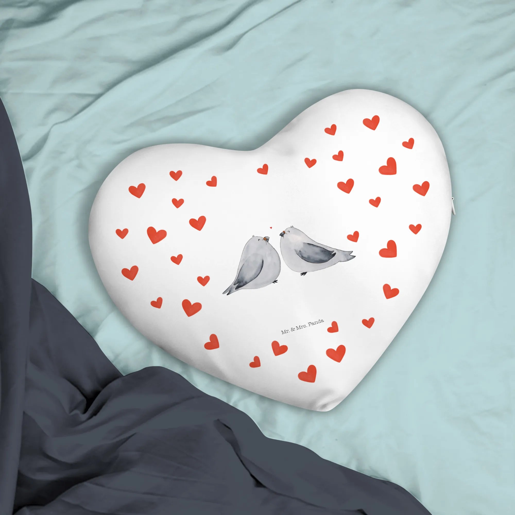 Das Herzkissen Turteltauben Liebe von Mr. & Mrs. Panda ist das perfekte Geschenk für all jene, die die Liebe feiern möchten. Ob zum Hochzeitstag, dem Jahrestag oder einfach so, um deine Zuneigung zu zeigen – dieses Kissen ist ein wahrer Liebesbeweis. Mit einem zauberhaften Design von zwei stilisierten Turteltauben, die sich liebevoll zueinander neigen, und einem schwebenden roten Herzen dazwischen, bringt es ein Stück Romantik in jedes Zuhause.