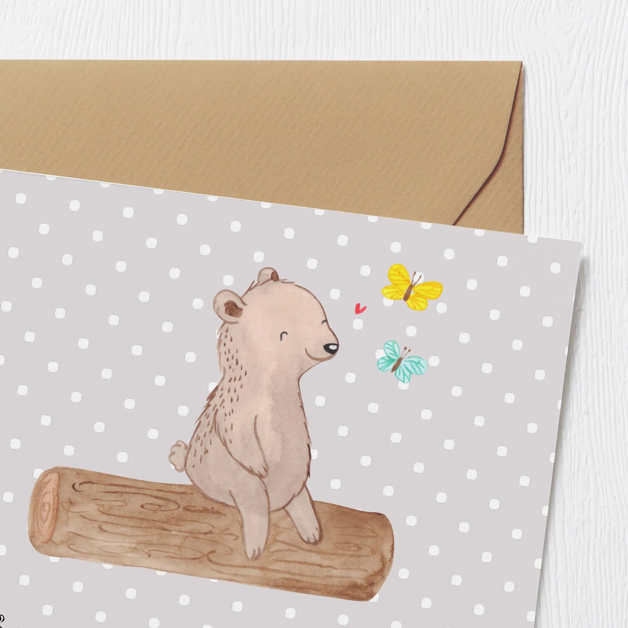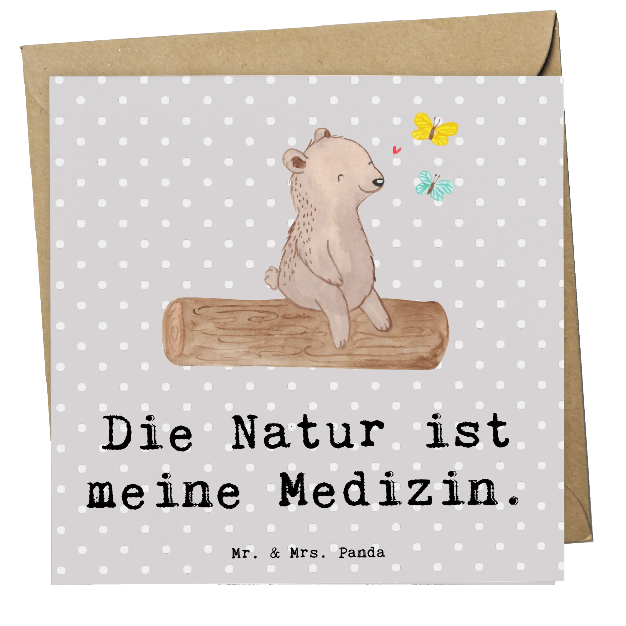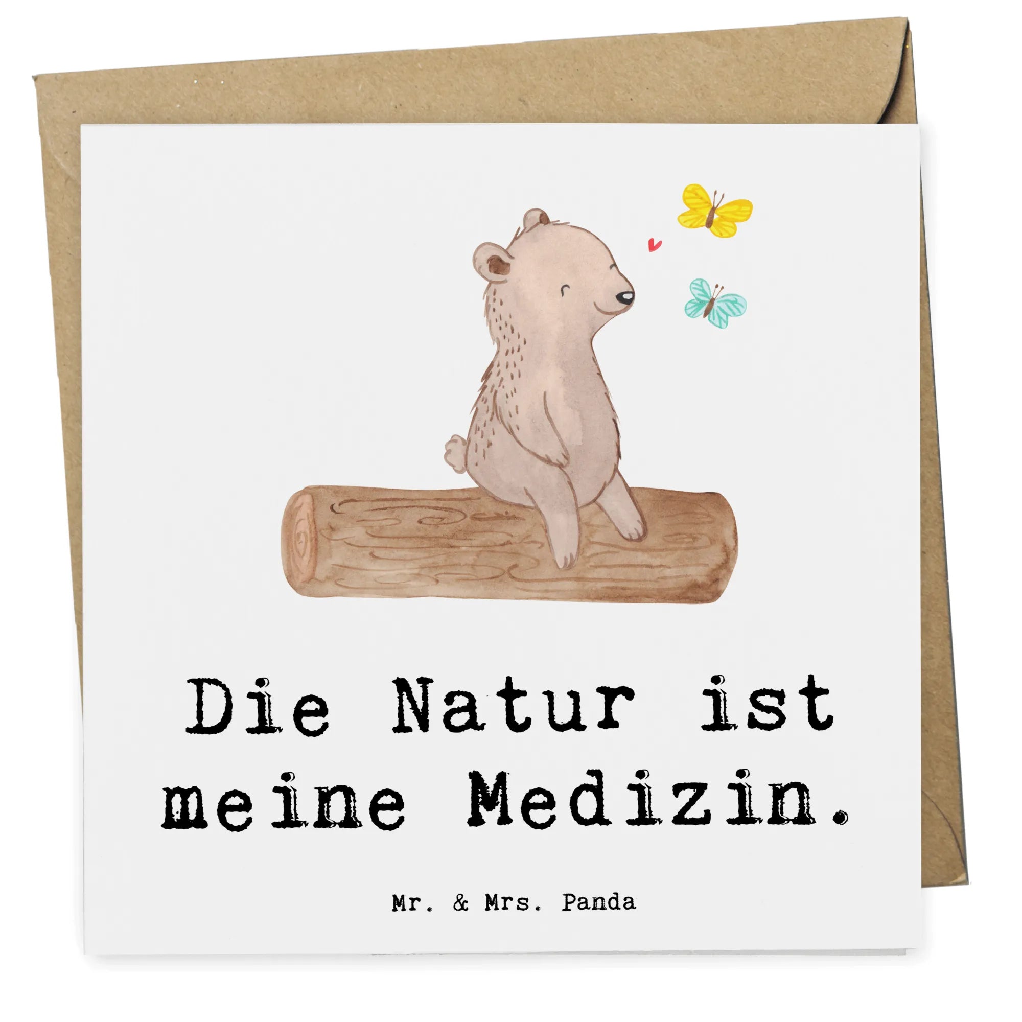 Das süße Motiv zeigt einen zufriedenen Bären, der auf einem Baumstamm sitzt und den tanzenden Schmetterlingen zuschaut. Die Kombination aus der Botschaft "Die Natur ist meine Medizin" und dem entzückenden Design spricht insbesondere Naturliebhaber und Outdoor-Fans an. Die matte Innenseite der Karte lässt sich hervorragend beschriften und bietet genügend Platz für Deine persönlichen Worte.