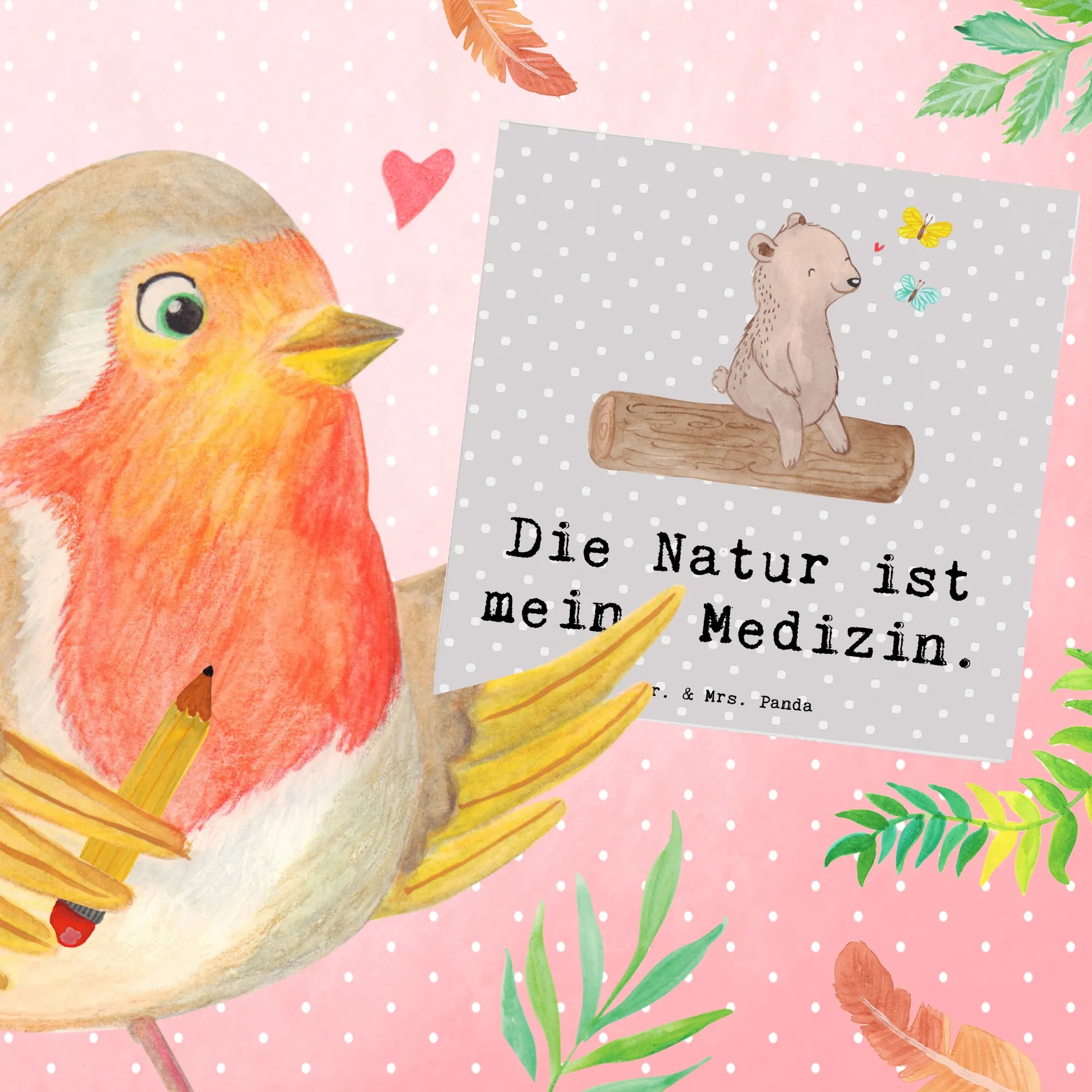 Das süße Motiv zeigt einen zufriedenen Bären, der auf einem Baumstamm sitzt und den Schmetterlingen zuschaut, die durch die Luft tanzen. Mit dem hinreißenden Slogan "Die Natur ist meine Medizin" bringt diese Karte ein wenig Naturverbundenheit direkt zu dir!