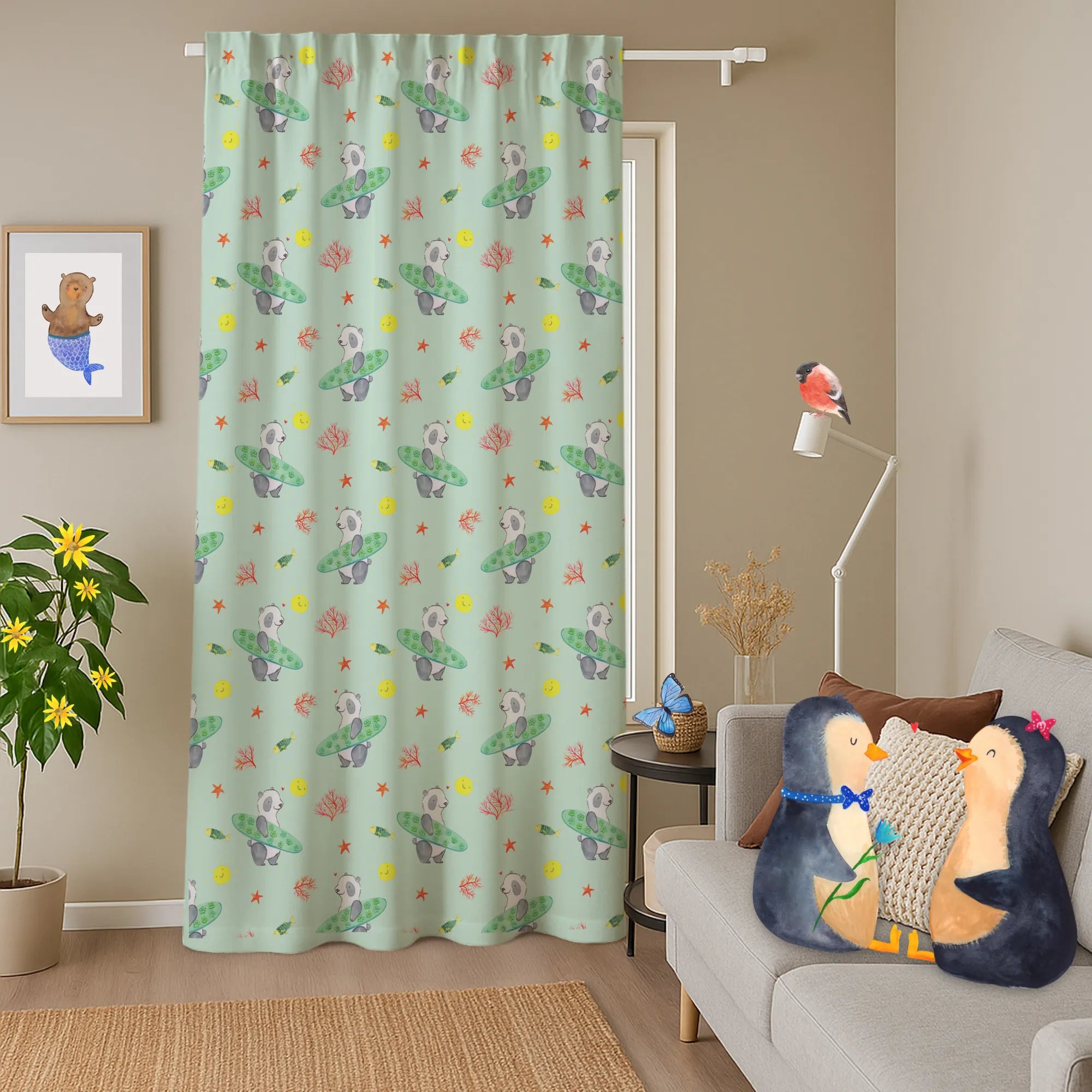 Die Pflege ist kinderleicht: Wasche deinen Baumwollvorhang einfach bei 30°C, damit die Farben strahlend bleiben. Tauche ein in die Welt von Mr. & Mrs. Panda und lass dich von der Lebensfreude unseres surfenden Pandas anstecken! 🐼