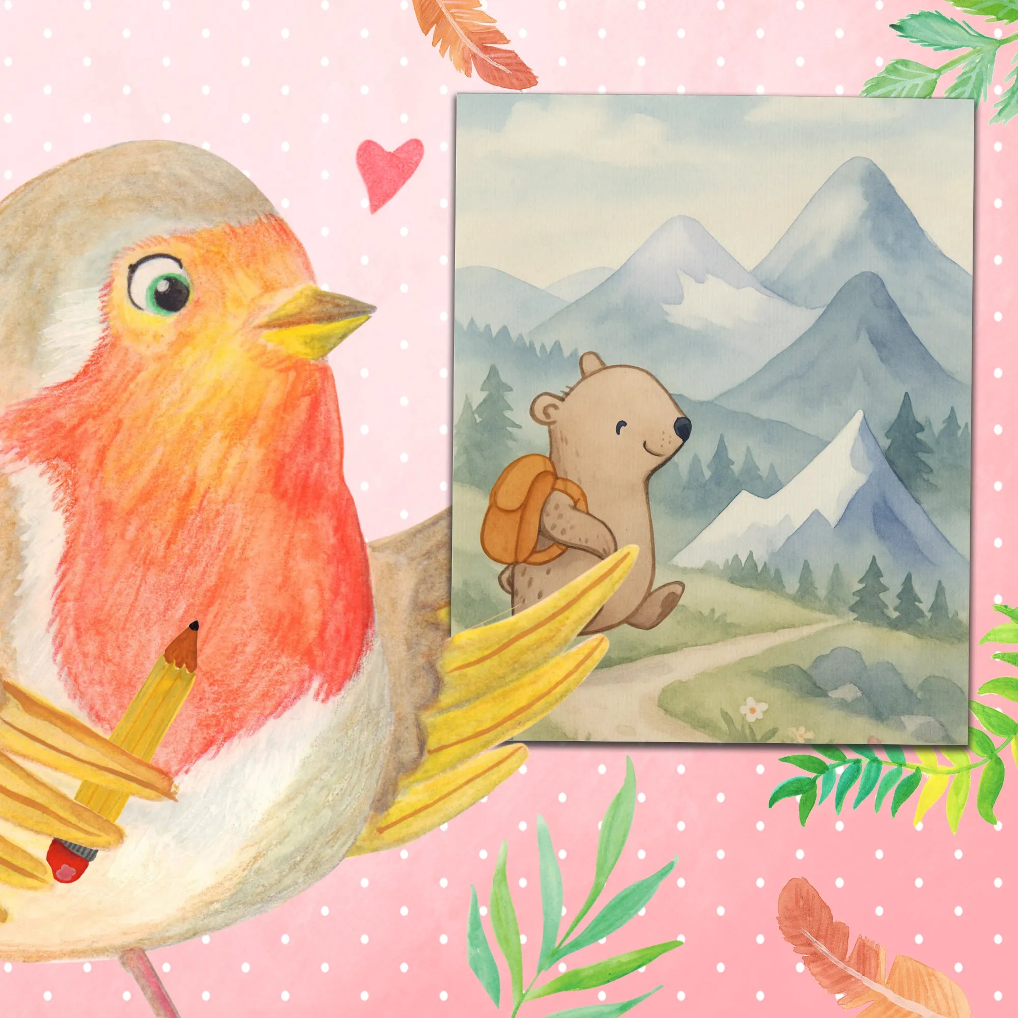 Hier kommt ein kleines Stück Wanderfreude zum Anfassen: Ein niedlicher Bär mit Rucksack stapft motiviert den Weg entlang und lädt dich ein, mitzukommen. Dieses Motiv dreht sich ganz ums Wandern – ums Entdecken von Pfaden, um das Rascheln der Blätter und um die kleinen Pausen mit Schokolade aus der Tasche. Der Bär wirkt freundlich, ein bisschen staunend und gleichzeitig voller Tatendrang. Er ist kein schneller Läufer, sondern ein genussvoller Wanderer, der jeden Schritt bewusst erlebt und die Aussicht zum Teilen bereit hat. Genau diese Stimmung möchten wir mit dem Motiv einfangen: Wandern als Wohlfühl-Moment, als Auszeit für die Seele und als Einladung, die eigene Umgebung neu zu sehen. Ob für deinen Rucksack, dein Shirt oder als Geschenk für Menschen, die gern draußen sind – dieses Motiv ist ein sanfter Anstoß, öfter mal die Schuhe zu schnüren und loszugehen. Lass dich vom Blick des kleinen Bären anstecken, spür das Knistern des Abenteuers unter den Sohlen und erinnere dich daran, dass jede Tour, egal wie kurz, ein echtes Geschenk ist.