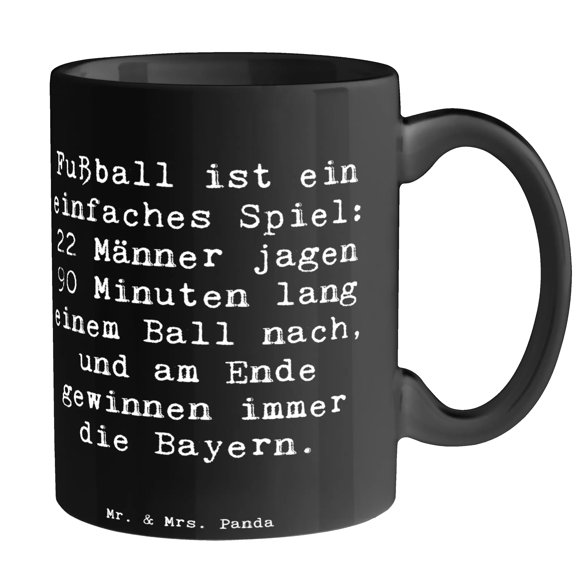 Suchst du nach einem Geschenk, das Humor und Fußball-Leidenschaft verbindet? Unsere Mr. & Mrs. Panda Tasse aus der Sportarten-Kollektion bringt beides zusammen: auf schwarzem Hintergrund prangt der witzige Spruch: "Fußball ist ein einfaches Spiel: 22 Männer jagen 90 Minuten lang einem Ball nach, und am Ende gewinnen immer die Bayern." Ein echter Stimmungsmacher beim Frühstück, in der Pause oder nach dem Training.
