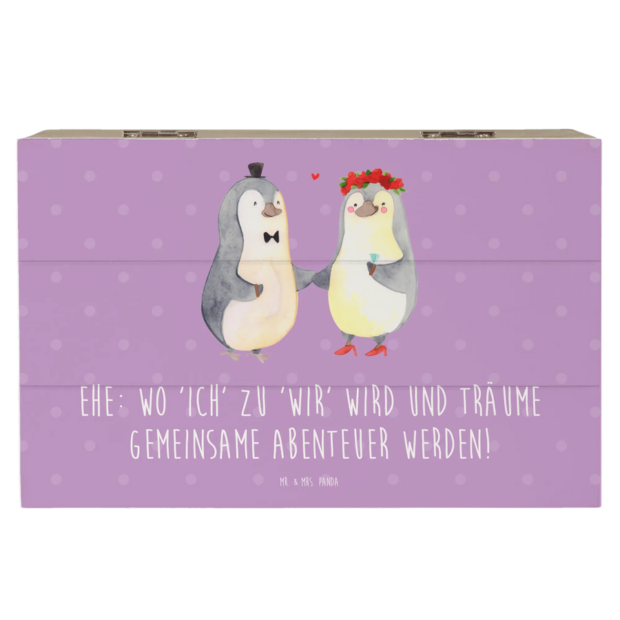 Die wunderschöne Holzkiste von Mr. & Mrs. Panda ist das perfekte Geschenk für alle, die eine besondere Hochzeit feiern möchten! Mit einem liebevollen Motiv zur Hochzeitsfeier und dem inspirierenden Spruch "Ehe: wo 'Ich' zu 'Wir' wird und Träume gemeinsame Abenteuer werden!" ist diese Erinnerungskiste nicht nur ein stylisches Accessoire, sondern auch der ideale Aufbewahrungsort für all deine wertvollsten Schätze.