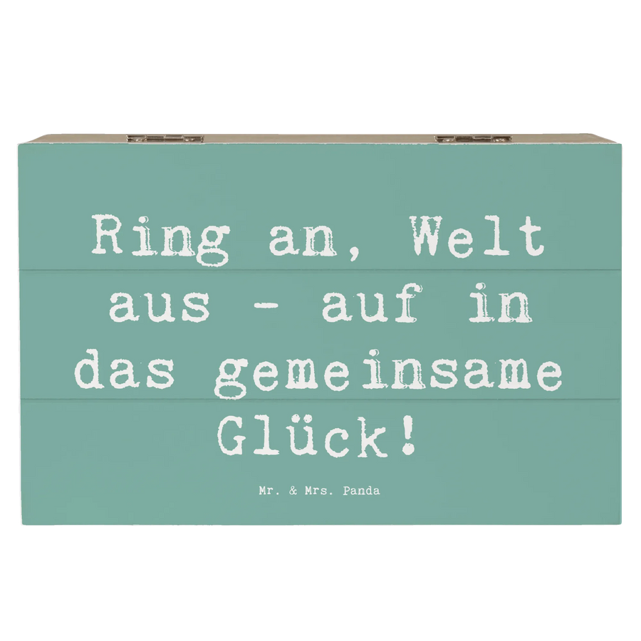 Der liebevoll gestaltete Spruch 'Ring an, Welt aus - auf in das gemeinsame Glück!' macht diese Erinnerungskiste besonders einzigartig und verbindet die Vorfreude auf das gemeinsame Leben.