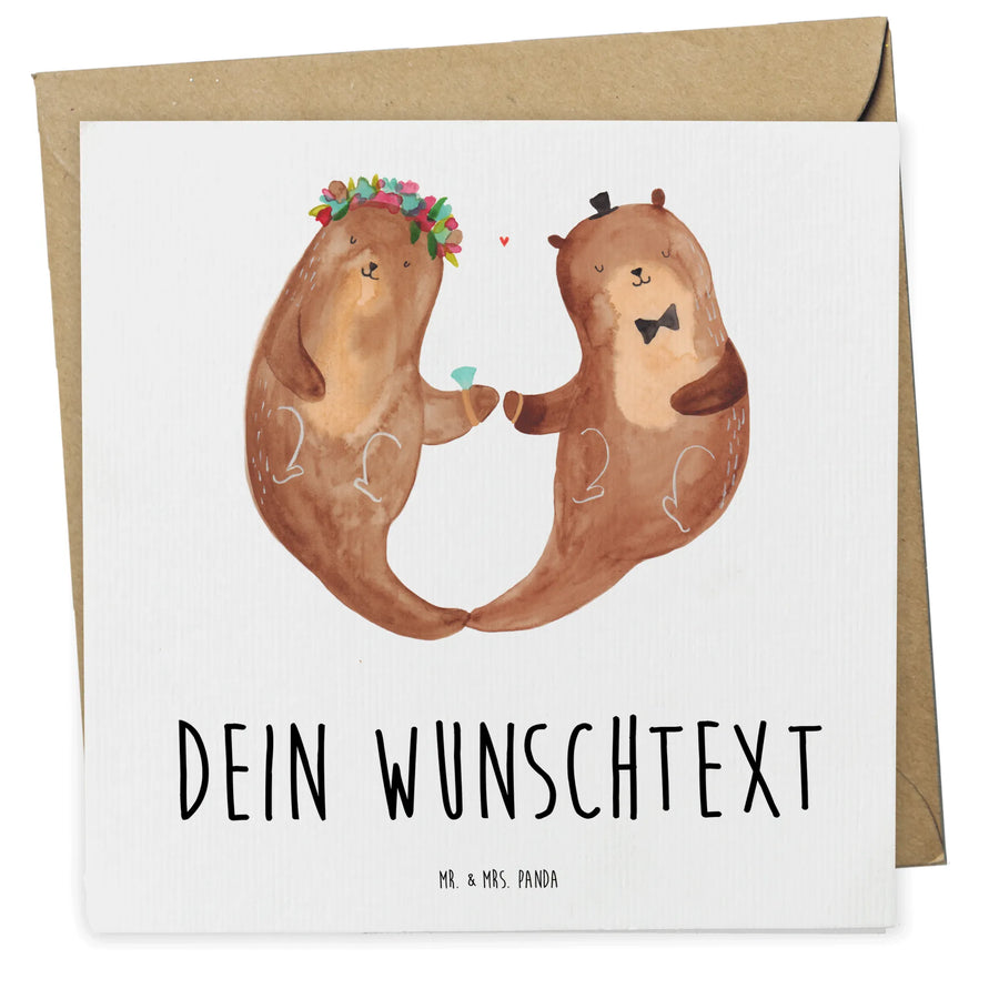Auf der Vorderseite prangt das fröhliche Bild von zwei süßen Ottern, die Händchen haltend ihren gemeinsamen Weg gehen. Die niedliche Otter Frau trägt stolz ihren Brautschleier, während der charmante Otter Mann einen kleinen Hut und ein Einstecktuch trägt. Bei der Auswahl dieser Karte entscheidet man sich für ein echtes Unikat, das nicht nur mit einem schönen Motiv, sondern auch mit dem Slogan "Von Herzen alles Liebe zu eurer Hochzeit!" personalisiert werden kann.
