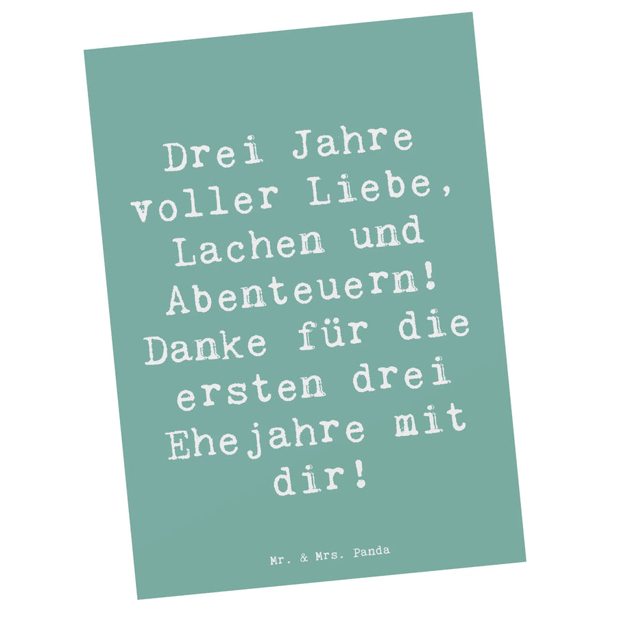 Die Postkarte zum 3. Hochzeitstag 'Lederhochzeit' von Mr. & Mrs. Panda ist das perfekte Geschenk für alle, die ihre Liebe in Worte fassen möchten. Mit dem liebevollen Spruch 'Drei Jahre voller Liebe, Lachen und Abenteuern! Danke für die ersten drei Ehejahre mit dir!' bringt diese Karte das Herz jedes Vermählten zum Schmelzen. Egal ob du diese Karte für deinen Partner oder ein befreundetes Ehepaar aus deiner Hochzeitskollektion wählen möchtest, sie ist eine wundervolle Geste, um die schönsten drei Jahre der Ehe zu feiern.