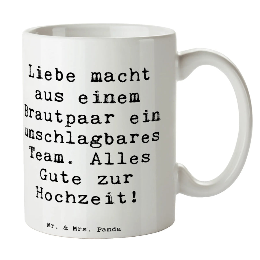 Die wunderschöne Keramiktasse von Mr. & Mrs. Panda mit dem Herzen-mit Text-Spruch: "Liebe macht aus einem Brautpaar ein unschlagbares Team. Alles Gute zur Hochzeit!" ist das perfekte Geschenk für alle, die diesen magischen Moment im Leben eines Paares feiern möchten. Mit einem Füllvermögen von 325 ml ist sie ideal für einen gemütlichen Kaffee oder Tee am Morgen oder einem romantischen Abend zu zweit.