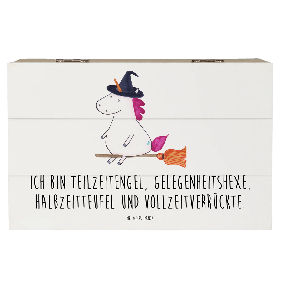 Du suchst nach einem ganz besonderen Geschenk? Dann ist die wunderschöne Holzkiste Einhorn Hexe von Mr. & Mrs. Panda genau das Richtige für dich! Mit ihrem magischen Design und dem inspirierenden Spruch "Ich bin Teilzeitengel, Gelegenheitshexe, Halbzeitteufel und Vollzeitverrückte" bringt diese Kiste nicht nur Freude, sondern auch eine Portion Spaß in jeden Raum. Diese Erinnerungskiste eignet sich perfekt, um die wertvollen Schätze deines Lebens aufzubewahren – seien es Fotos, kleine Erinnerungsstücke von besonderen Anlässen oder einfach nur die Texte deiner eigenen zauberhaften Geschichten.