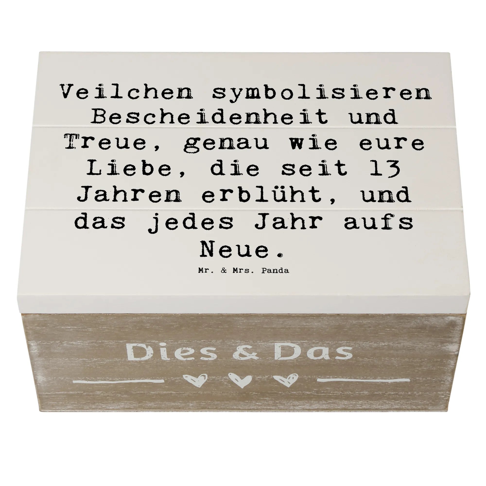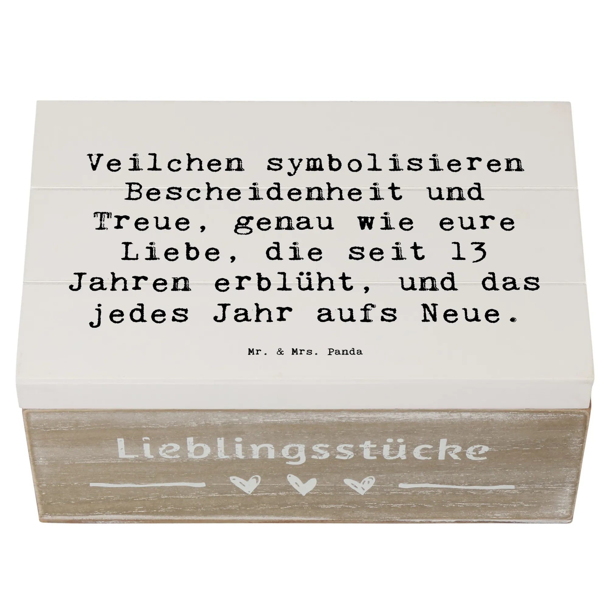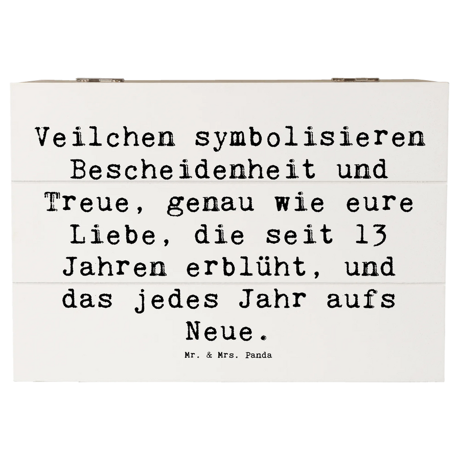 Entdecke die zauberhafte Holzkiste von Mr. & Mrs. Panda, perfekt für euren 13. Hochzeitstag! Diese wunderschöne Erinnerungskiste trägt das liebevolle Motiv 'Veilchenhochzeit', das Bescheidenheit und Treue symbolisiert. Deren zarter Spruch erinnert daran, dass eure Liebe seit 13 Jahren blüht und jedes Jahr aufs Neue erstrahlt.