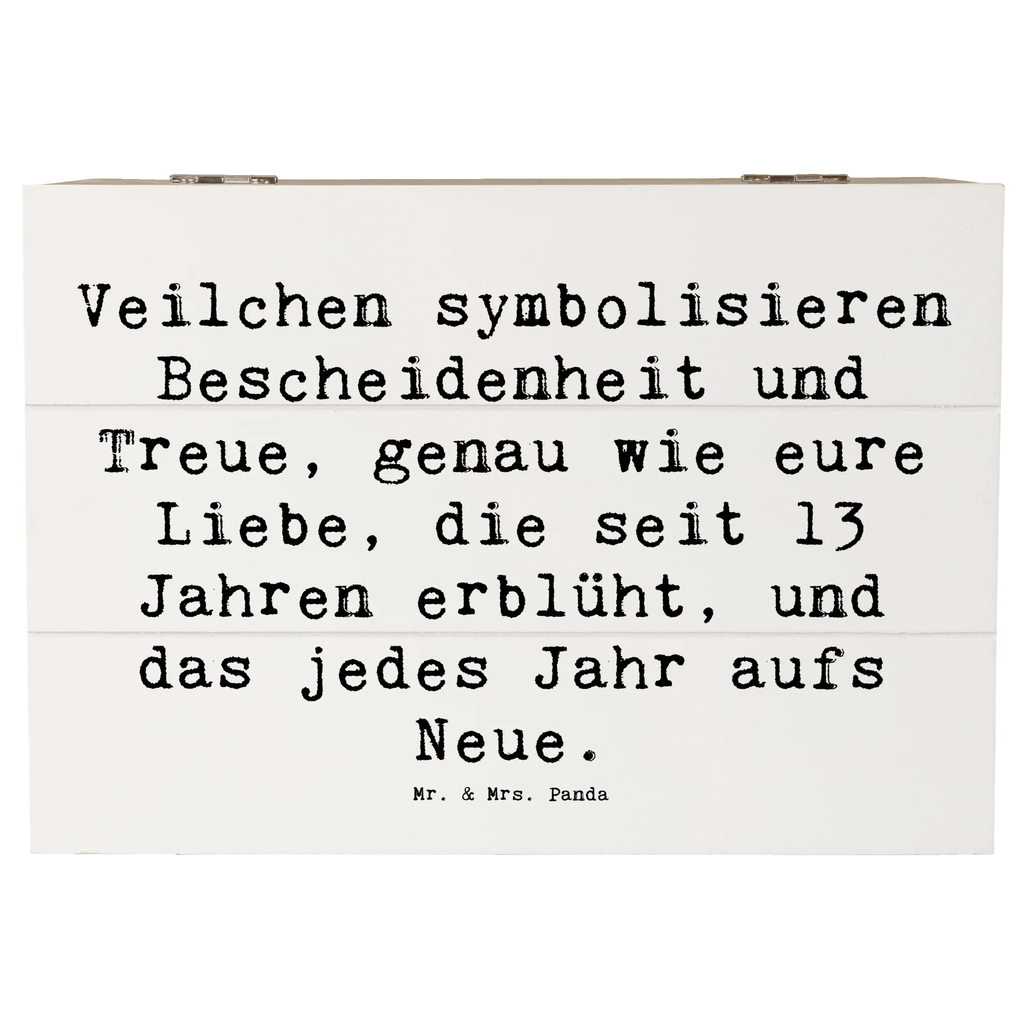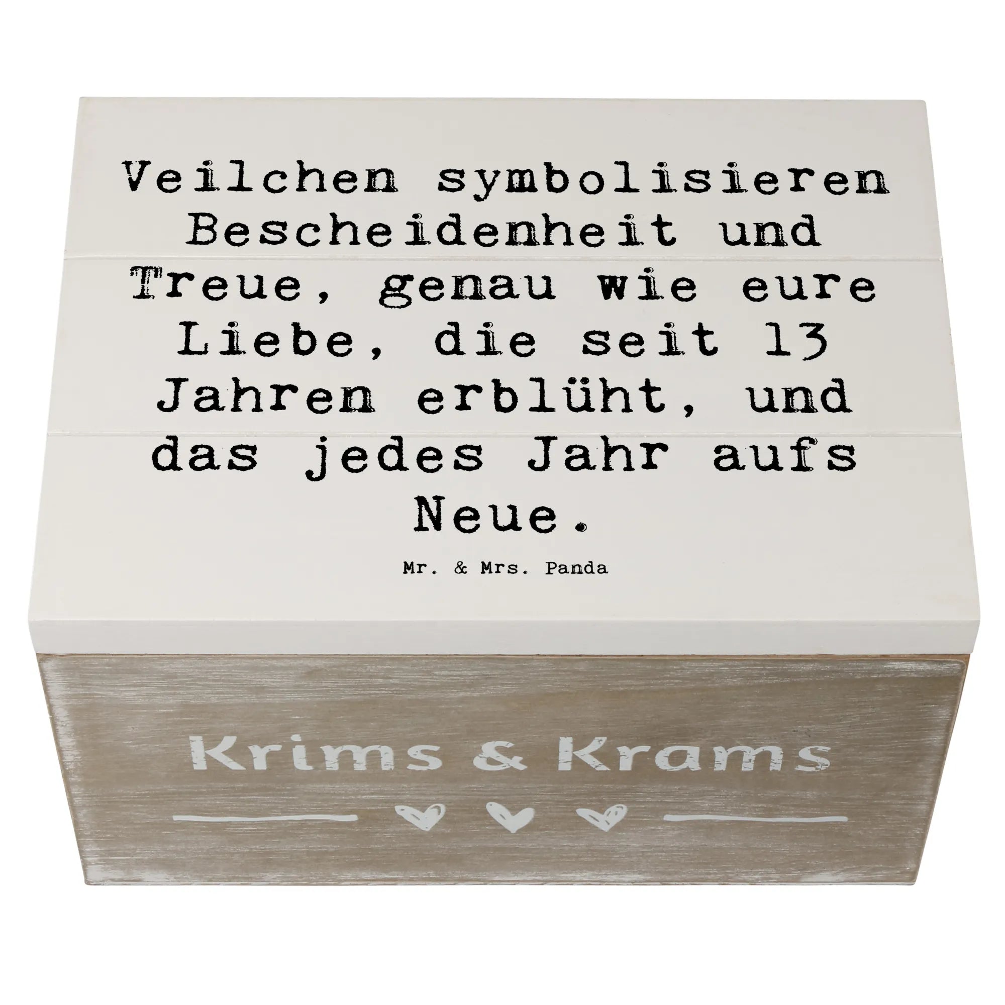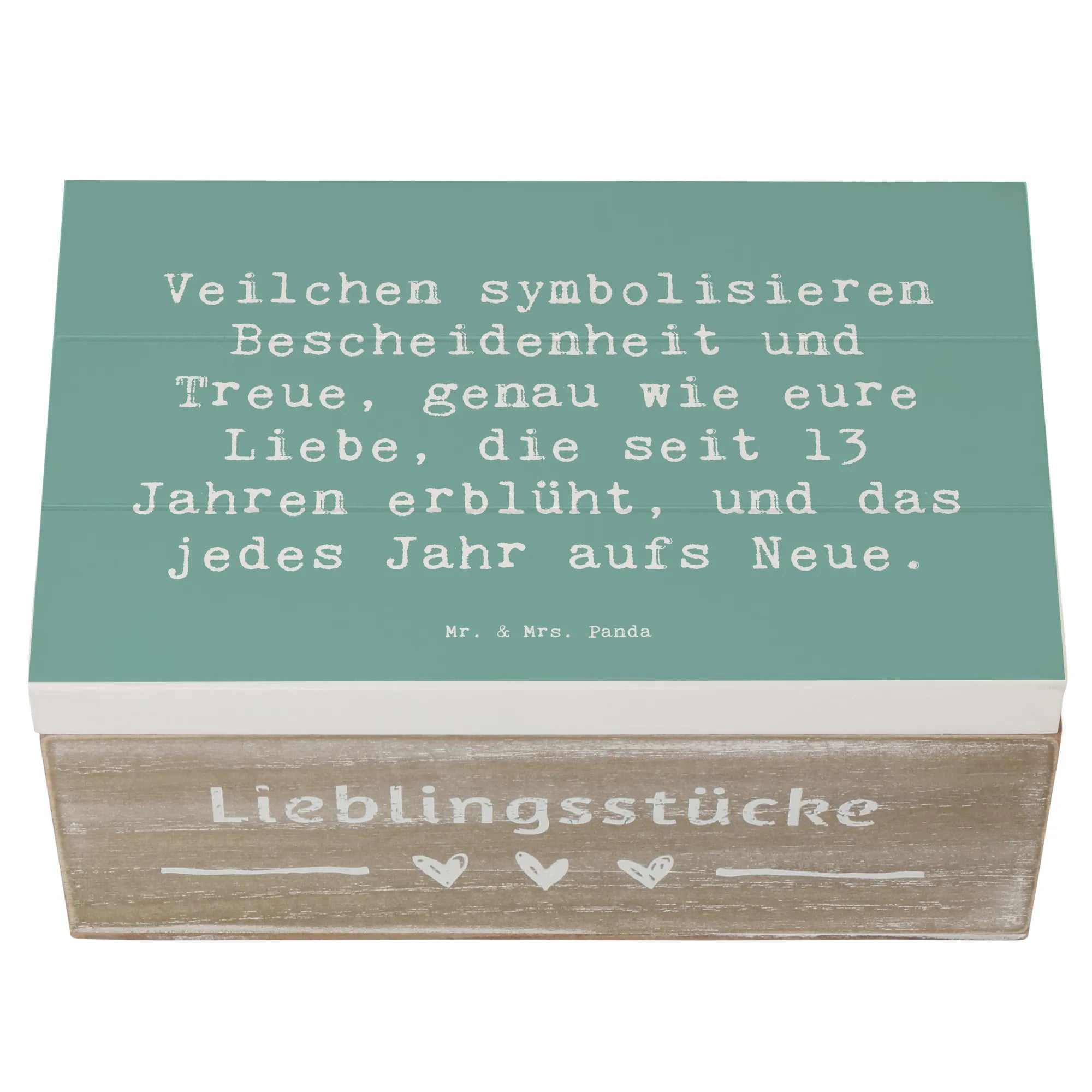 Entdecke die zauberhafte Holzkiste von Mr. & Mrs. Panda, perfekt für euren 13. Hochzeitstag! Diese wunderschöne Erinnerungskiste trägt das liebevolle Motiv 'Veilchenhochzeit', das Bescheidenheit und Treue symbolisiert. Deren zarter Spruch erinnert daran, dass eure Liebe seit 13 Jahren blüht und jedes Jahr aufs Neue erstrahlt.