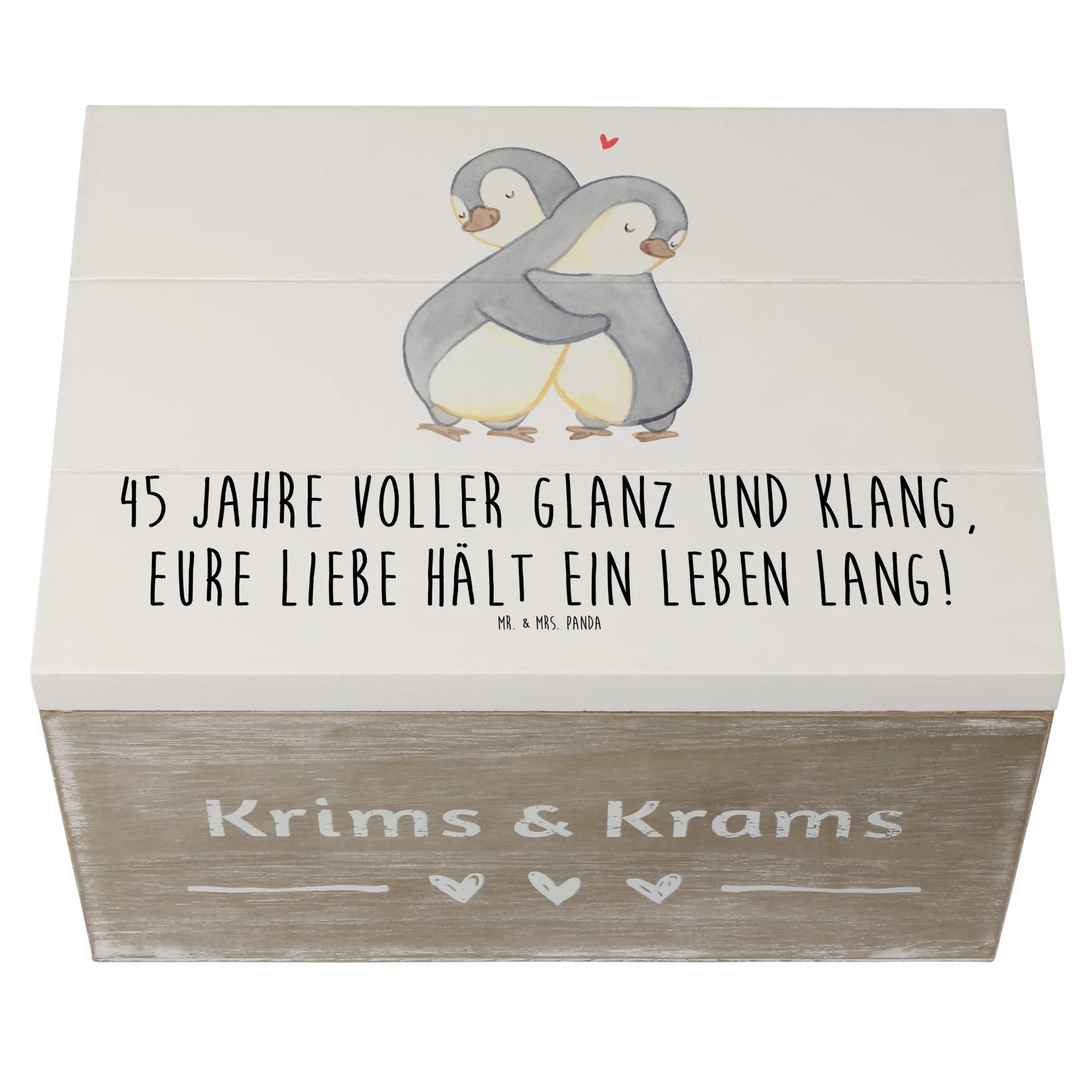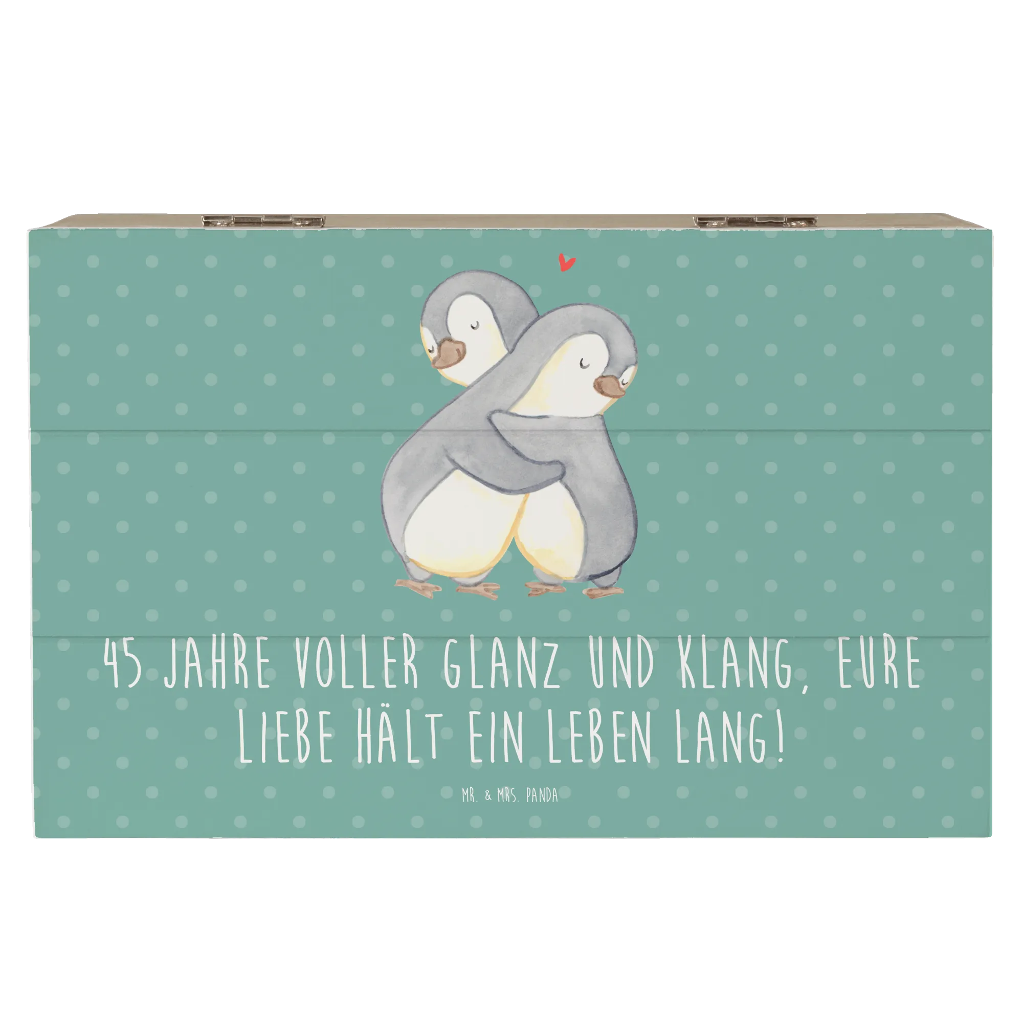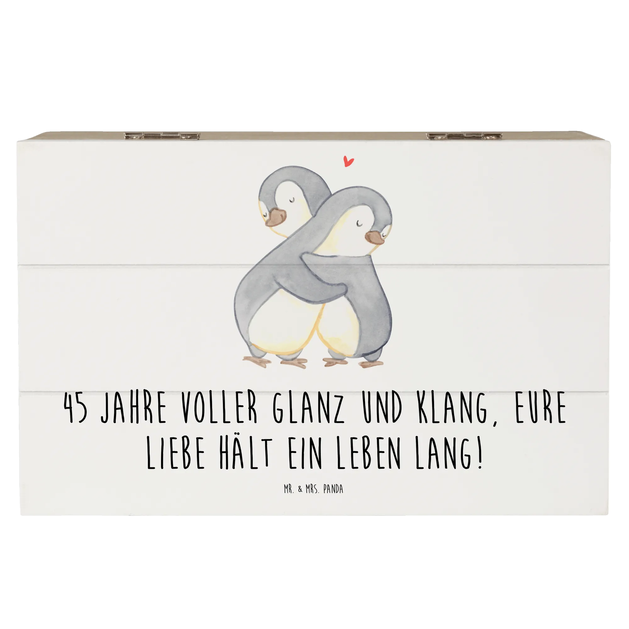 Die wunderschöne Holzkiste zum 45. Hochzeitstag von Mr. & Mrs. Panda ist nicht nur ein Geschenk, sondern ein emotionales Highlight für jeden, der seinen Messinghochzeitstag feiert! Mit dem charmanten Spruch "45 Jahre voller Glanz und Klang, eure Liebe hält ein Leben lang!" wird diese Erinnerungskiste zum perfekten Aufbewahrungsort für all die kostbaren Erinnerungen, die im Laufe der Jahre gesammelt wurden.