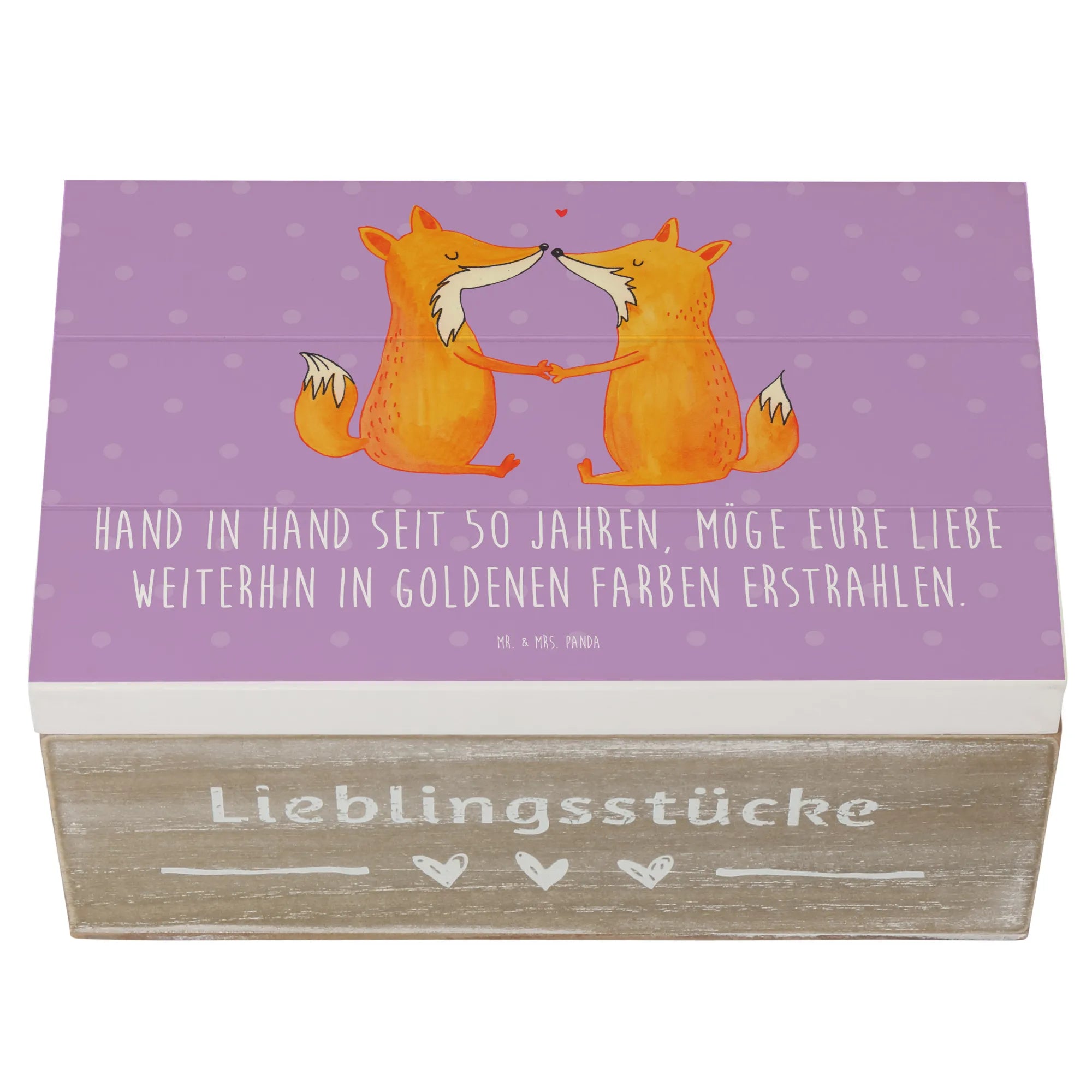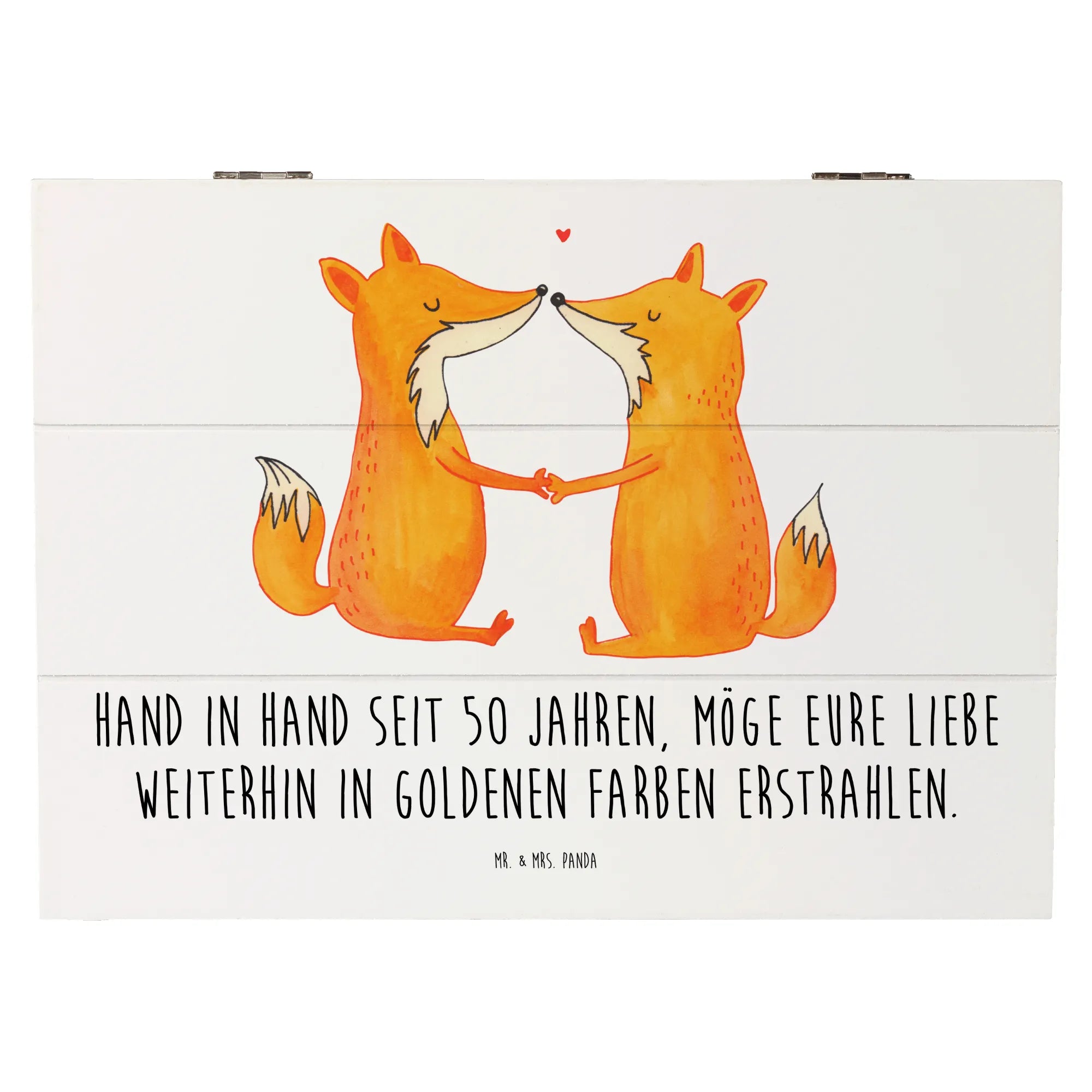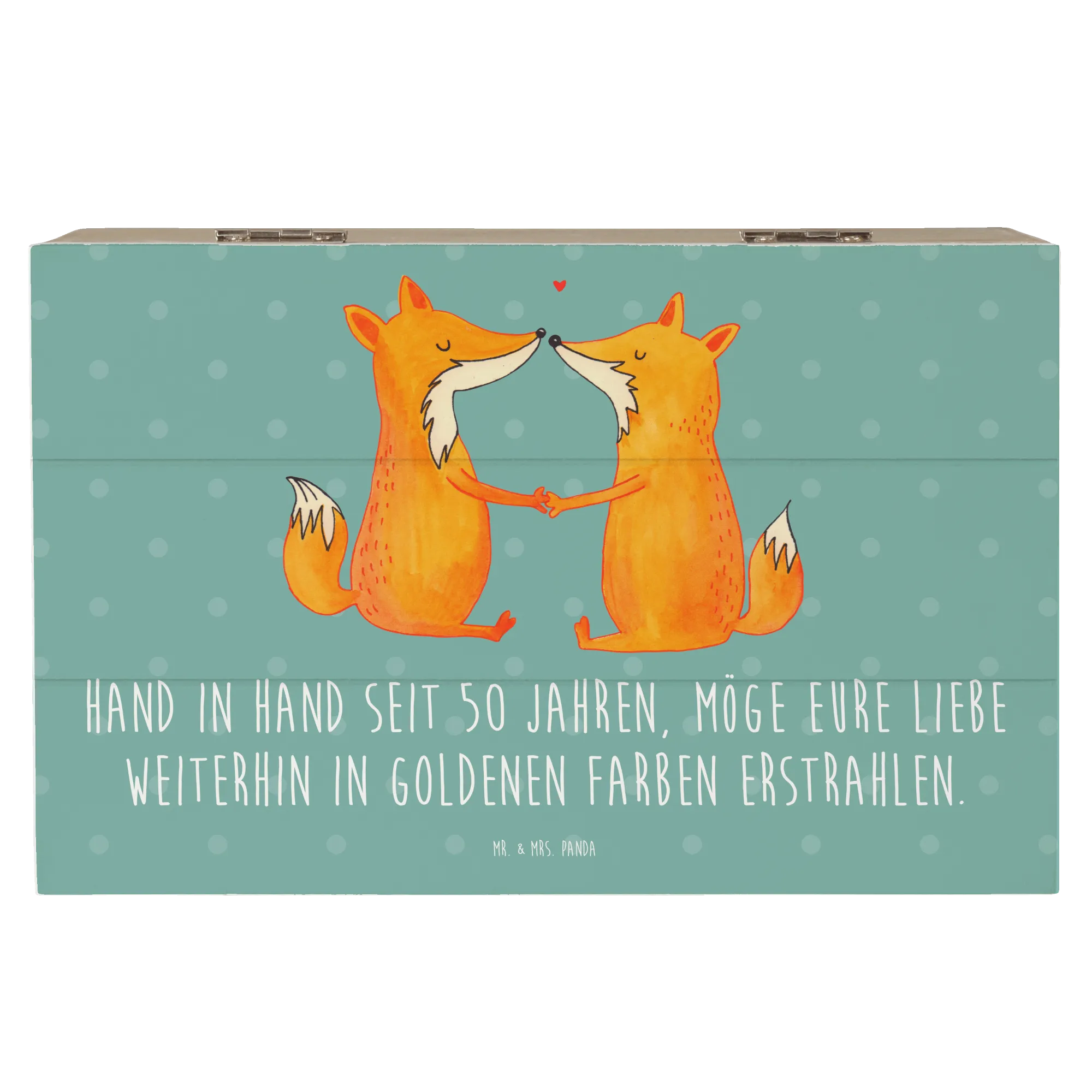 Die wunderschöne Holzkiste zum 50. Hochzeitstag – Goldene Hochzeit – von Mr. & Mrs. Panda ist das absolute Highlight jedes Geschenks! Diese außergewöhnliche Erinnerungskiste, bedruckt mit dem liebevollen Spruch "Hand in Hand seit 50 Jahren, möge eure Liebe weiterhin in goldenen Farben erstrahlen", ist nicht nur eine stilvolle Aufbewahrungslösung, sondern auch ein tolles Geschenk für Paare, die ihr halbes Jahrhundert an Zweisamkeit feiern.