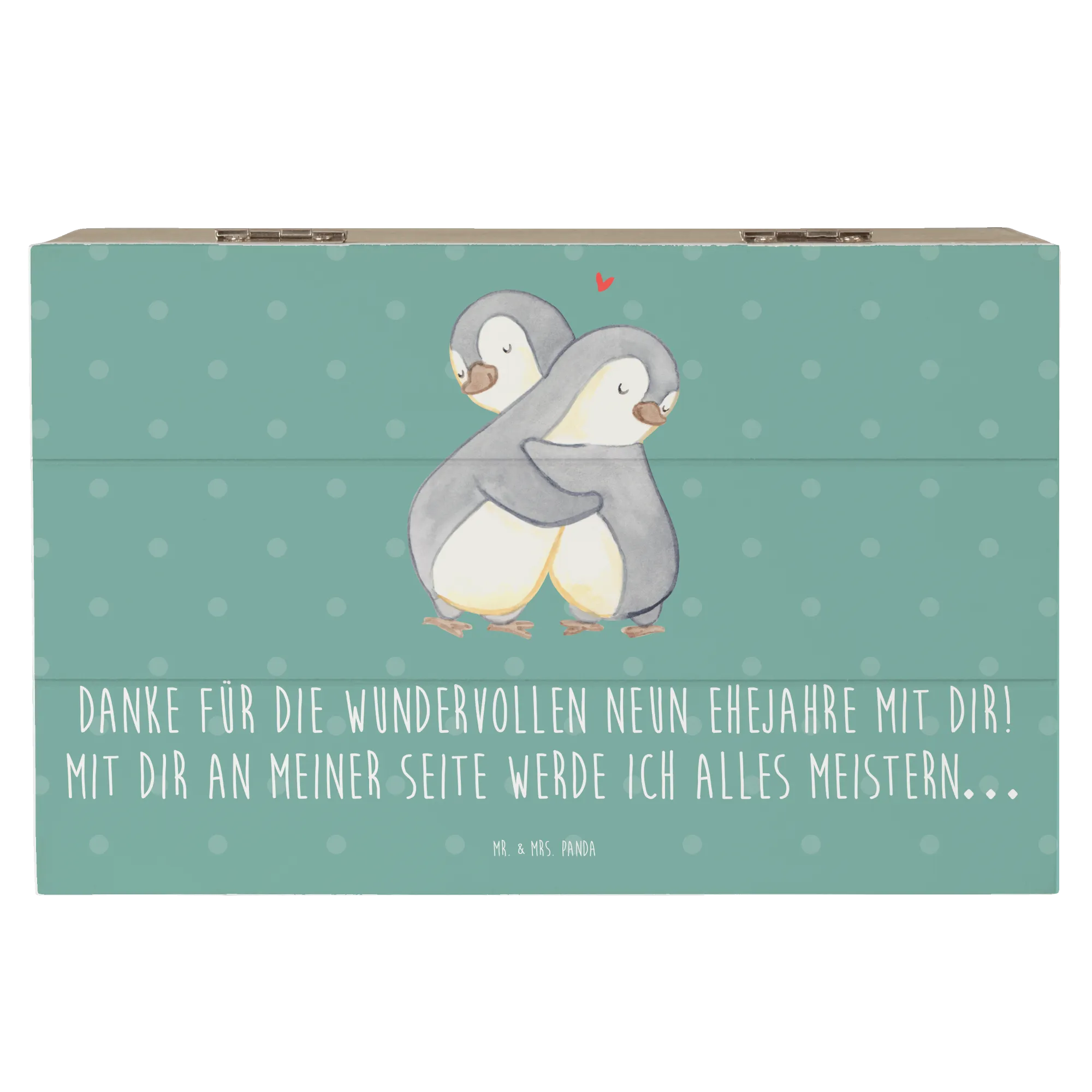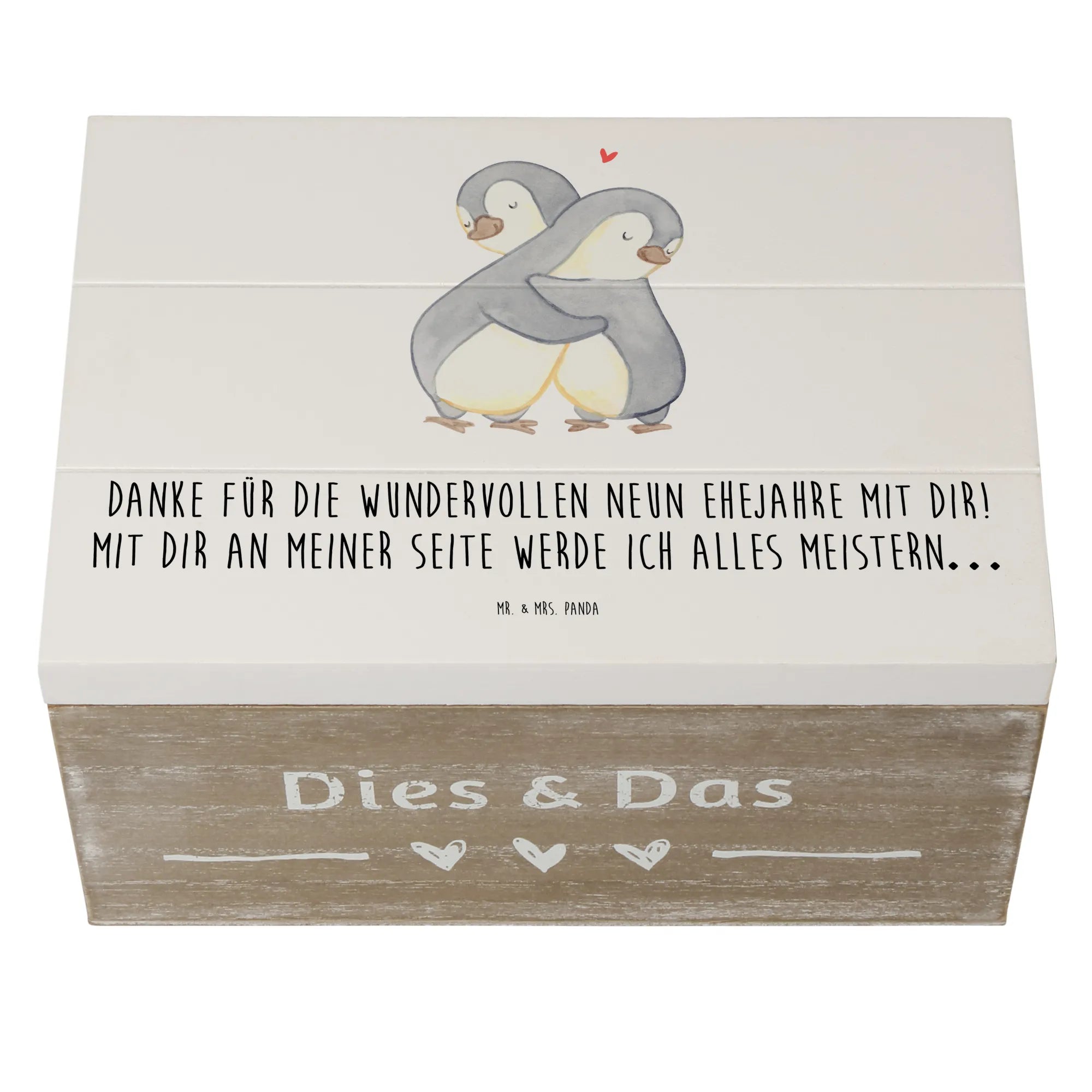 Die Kiste misst 220 mm x 150 mm x 120 mm und ist aus robuster Holzfaser gefertigt, die auch nach Jahren noch stabil bleibt. Mit den liebevollen Sprüchen von Mr. & Mrs. Panda wie "Danke für die wundervollen neun Ehejahre mit dir! Mit dir an meiner Seite werde ich alles meistern…" wird sie zu einem echten Emotionalitätsbringer in deinem Leben.