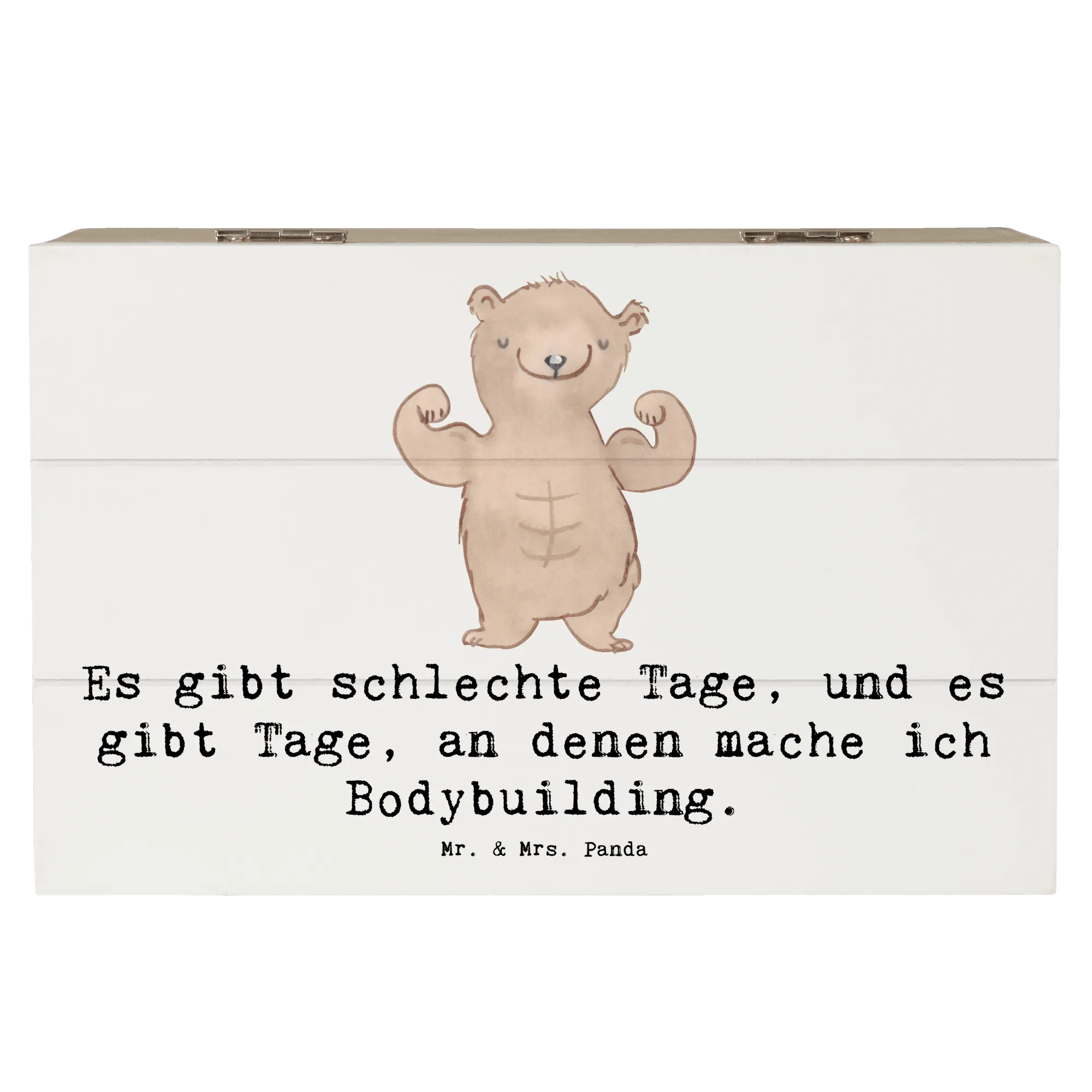 Diese wunderschöne Holzkiste von Mr. & Mrs. Panda ist das ideale Geschenk für alle Sportbegeisterten und Bodybuilding-Fans! Mit dem liebevollen Motiv eines süßen Bären, der stolz seine Muskeln zeigt, und dem Spruch "Es gibt schlechte Tage, und es gibt Tage, an denen mache ich Bodybuilding" ist diese Kiste nicht nur praktisch, sondern auch ein echter Hingucker.