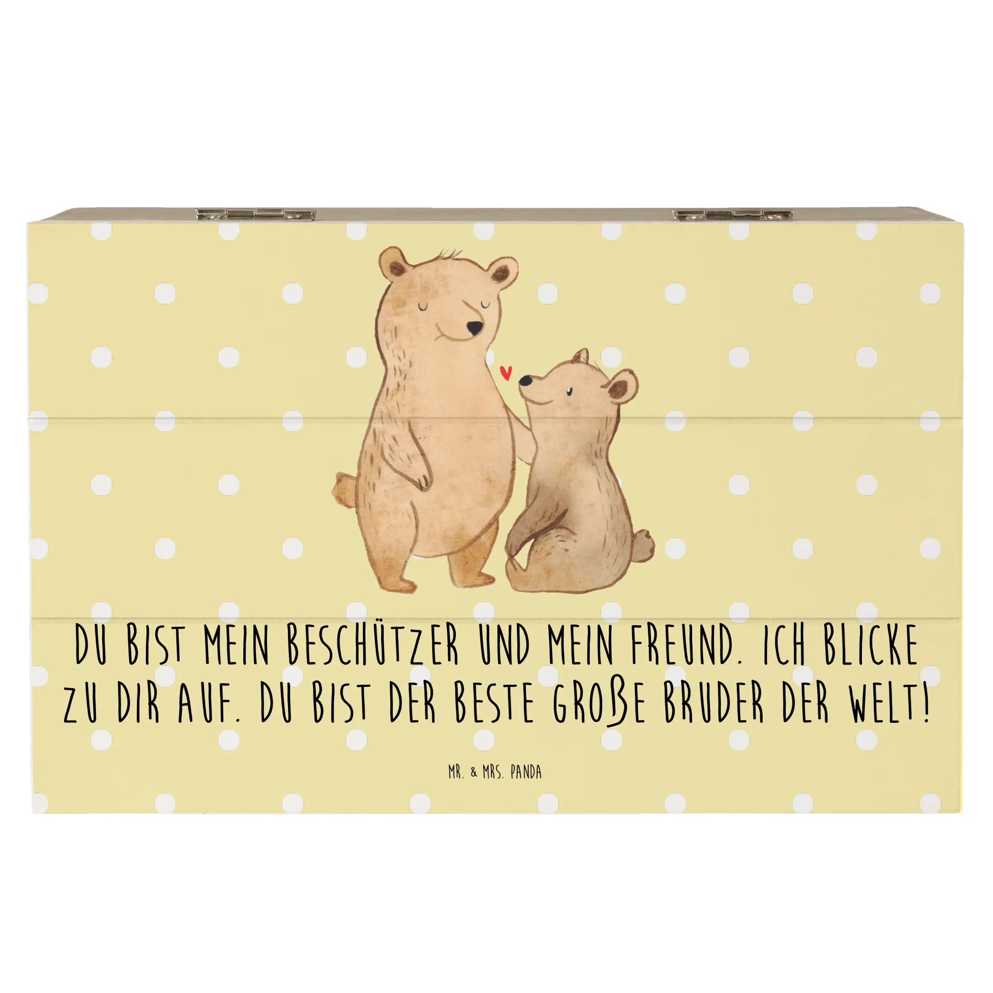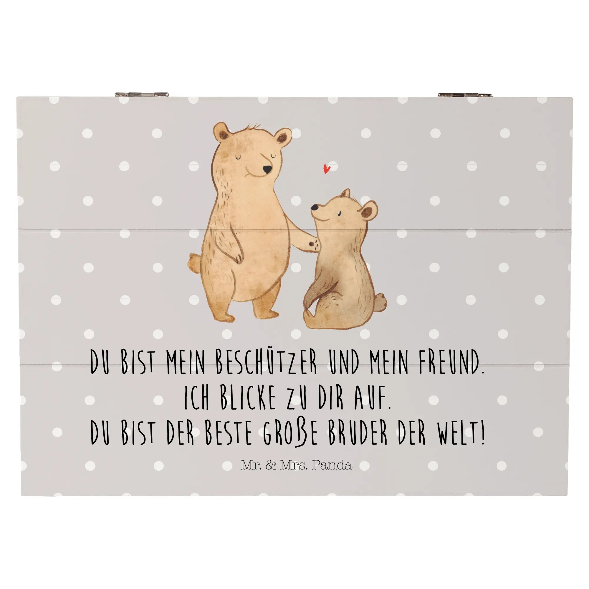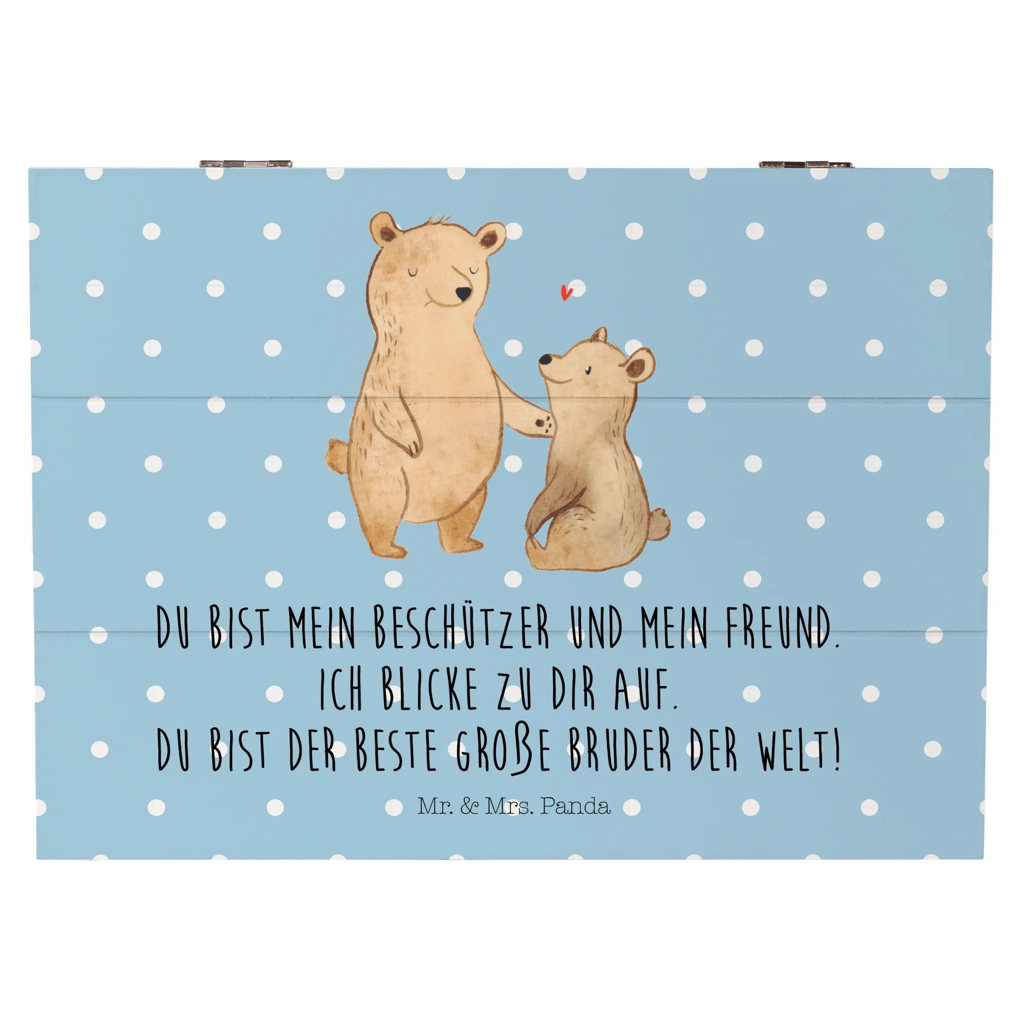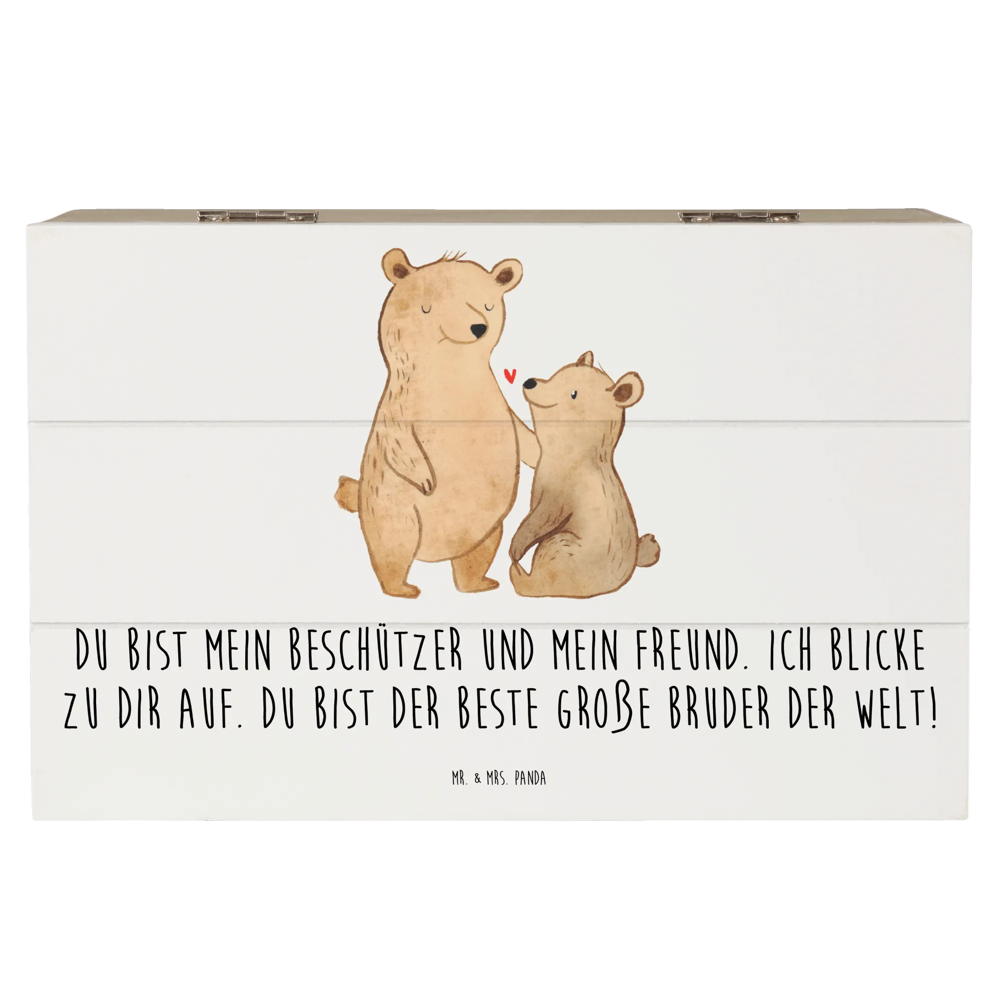 Die Kiste ist mit einem liebevollen Motiv von zwei Bären gestaltet, die einander verbunden sind. Der große Bruder hält seine Tatze schützend auf die Schulter des kleinen Bruders, während zwischen ihnen ein kleines rotes Herz schwebt. Dieses Design symbolisiert die innige Bindung und Liebe, die Geschwister füreinander empfinden. Der Slogan "Du bist mein Beschützer und mein Freund. Ich blicke zu dir auf. Du bist der beste große Bruder der Welt!" macht die Kiste zu einem noch persönlichen Geschenk, das die besonderen Momente der Geschwisterliebe festhält.