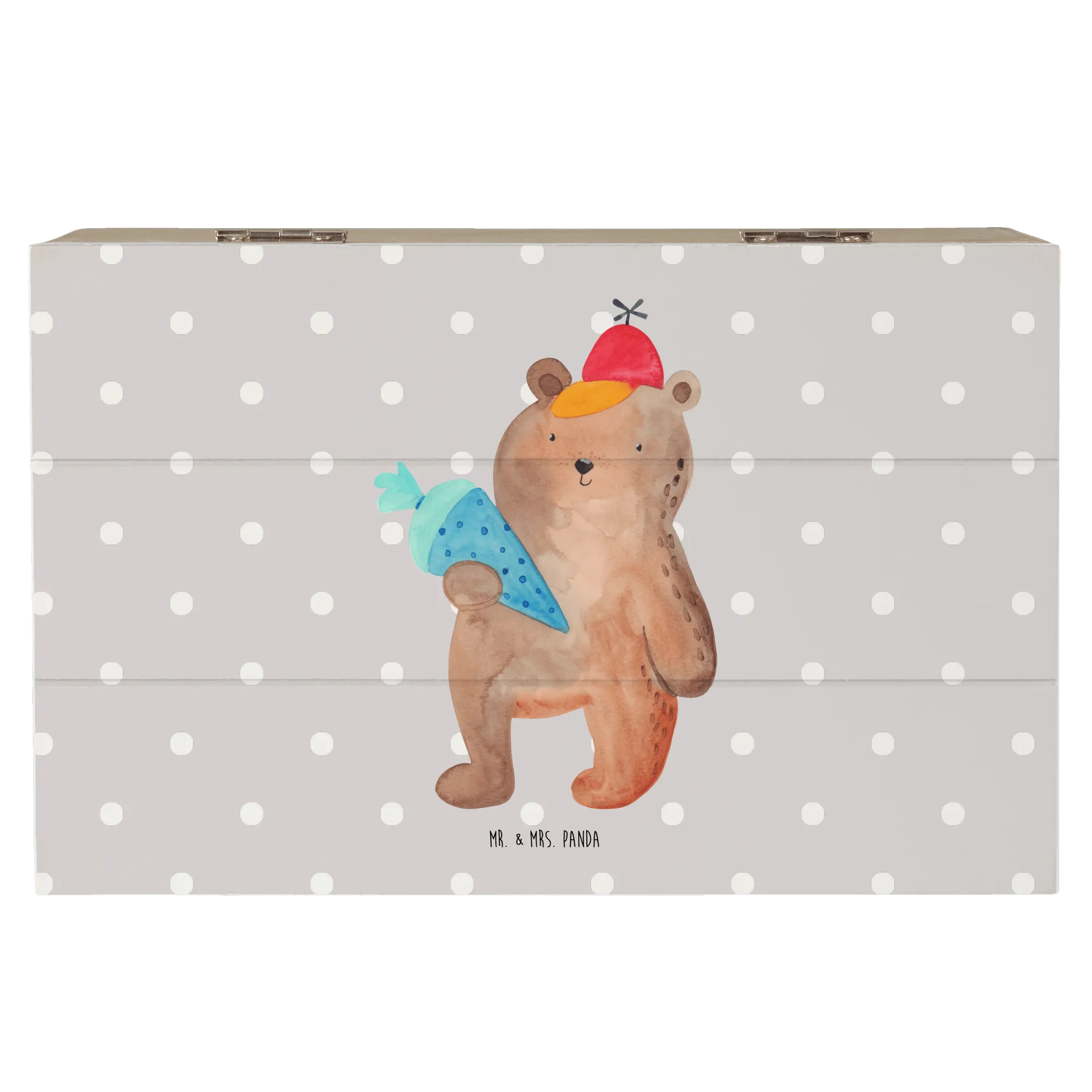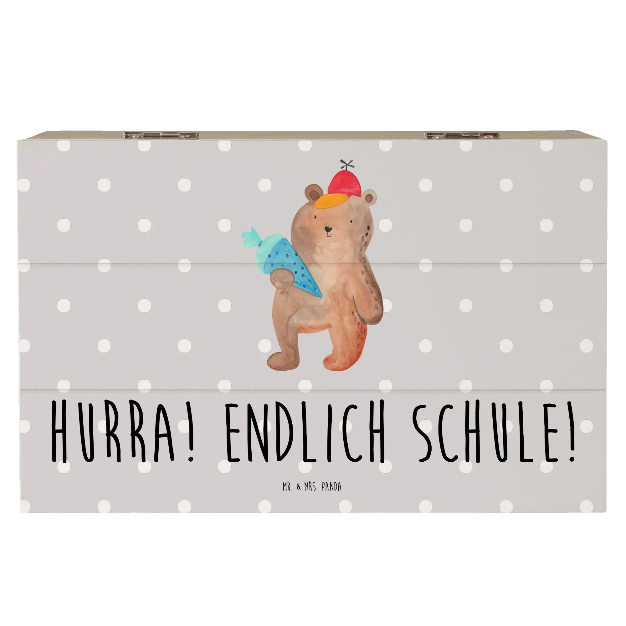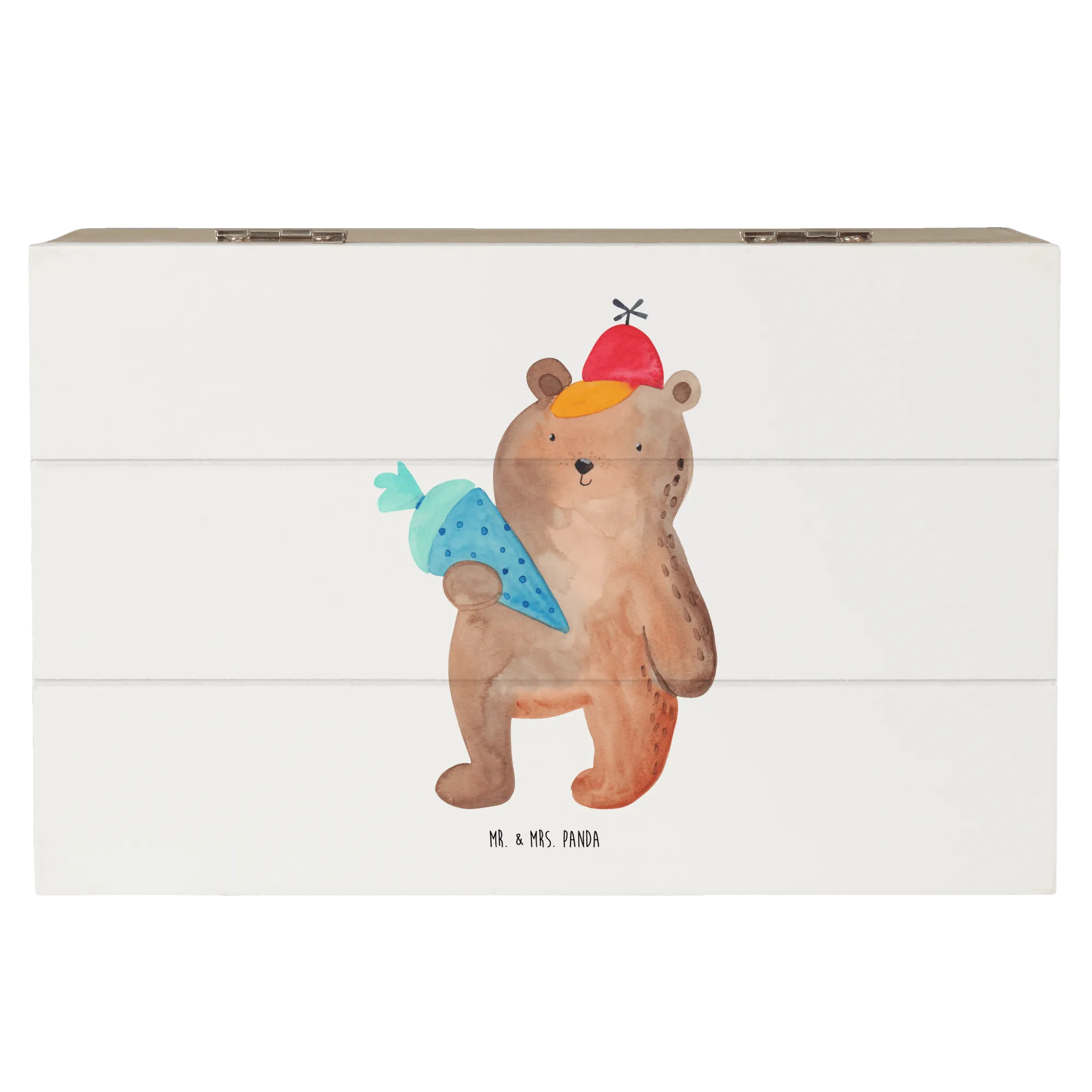 Entdecke die wundervolle Holzkiste mit dem süßen Bär-Motiv und der Schultüte von Mr. & Mrs. Panda! Diese einzigartige Erinnerungskiste ist perfekt für kleine Schulkinder, die ihren ersten Schultag mit einem besonderen Geschenk feiern möchten.