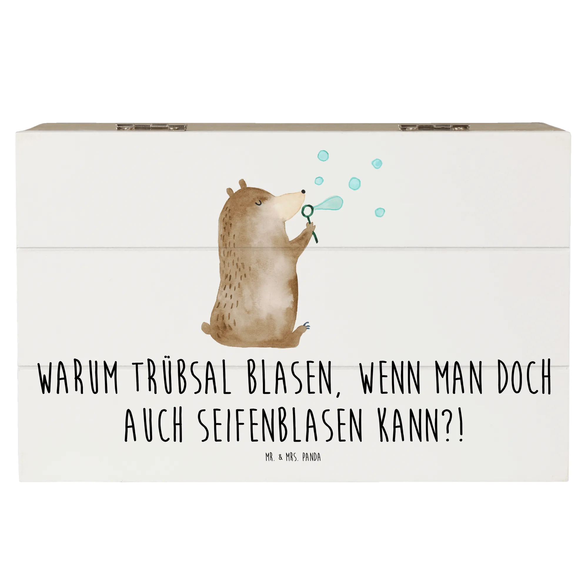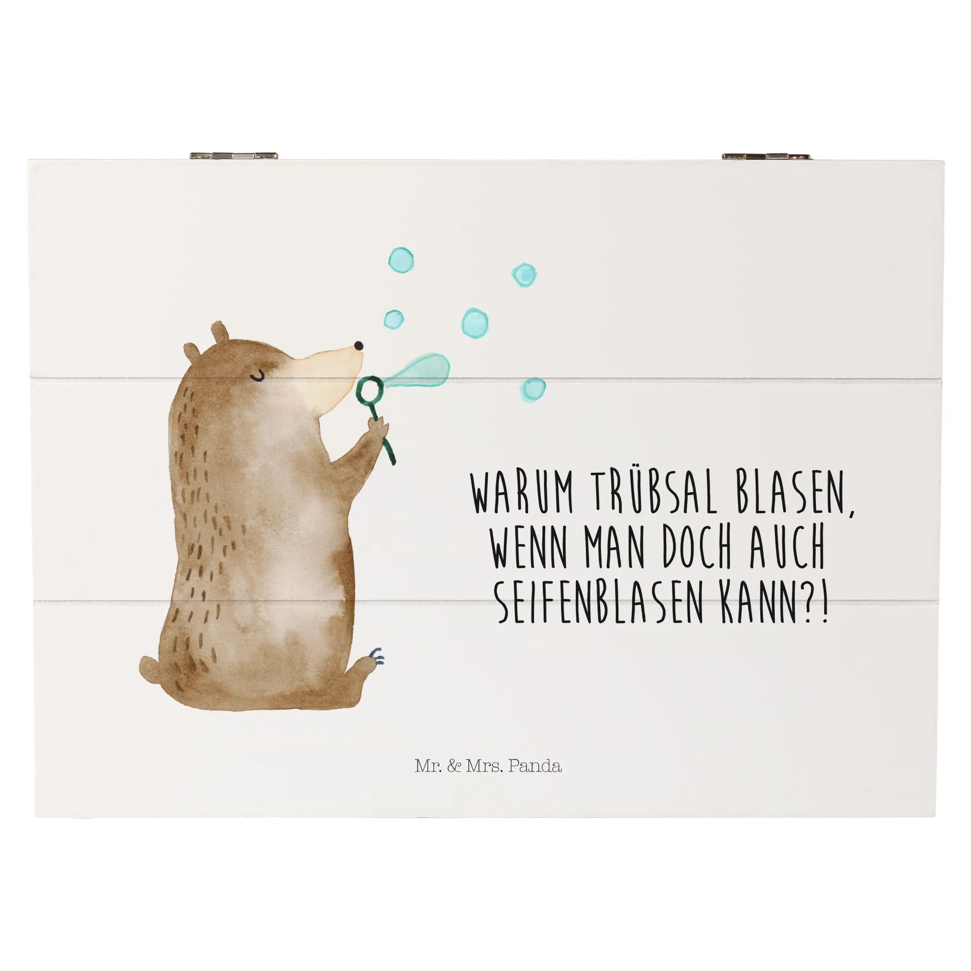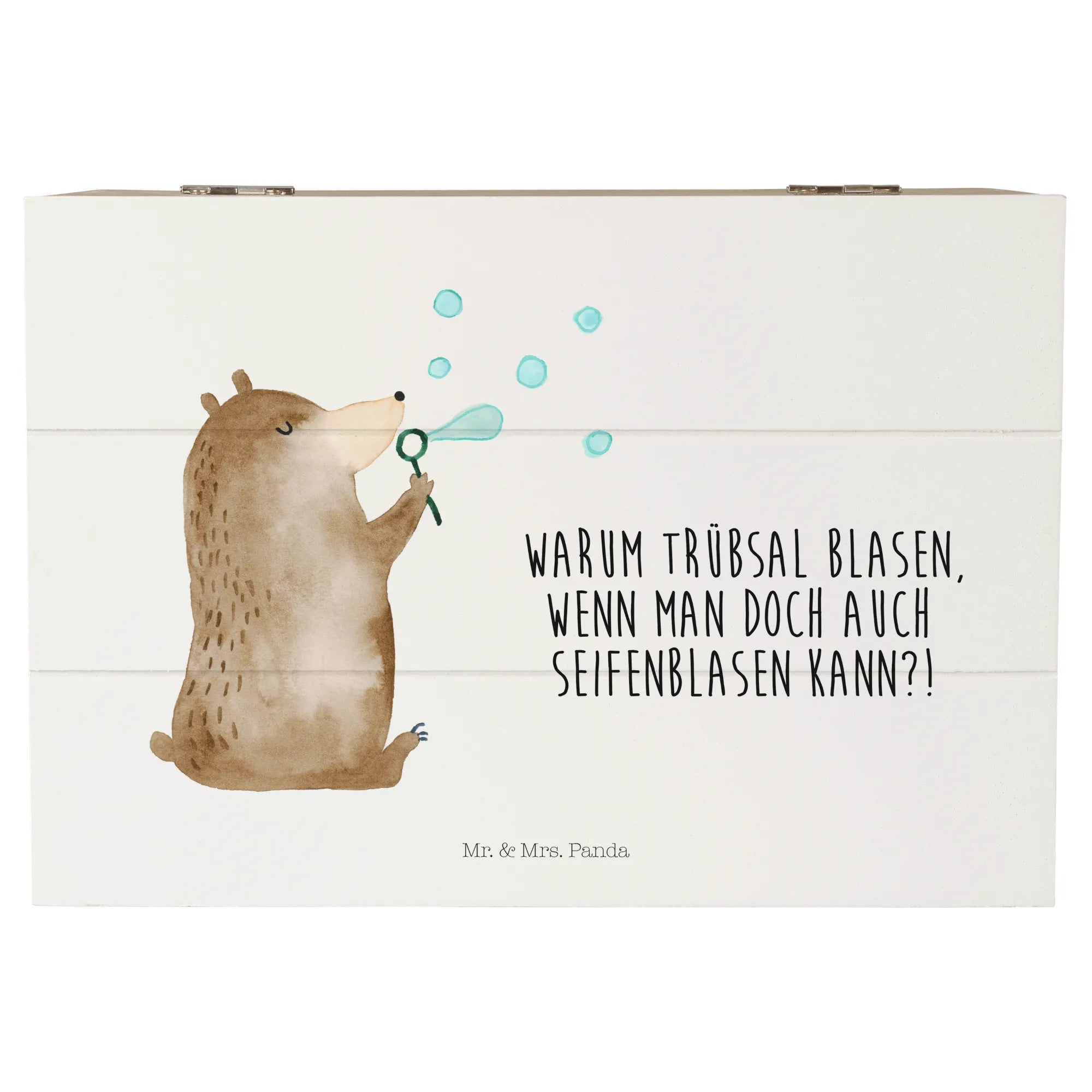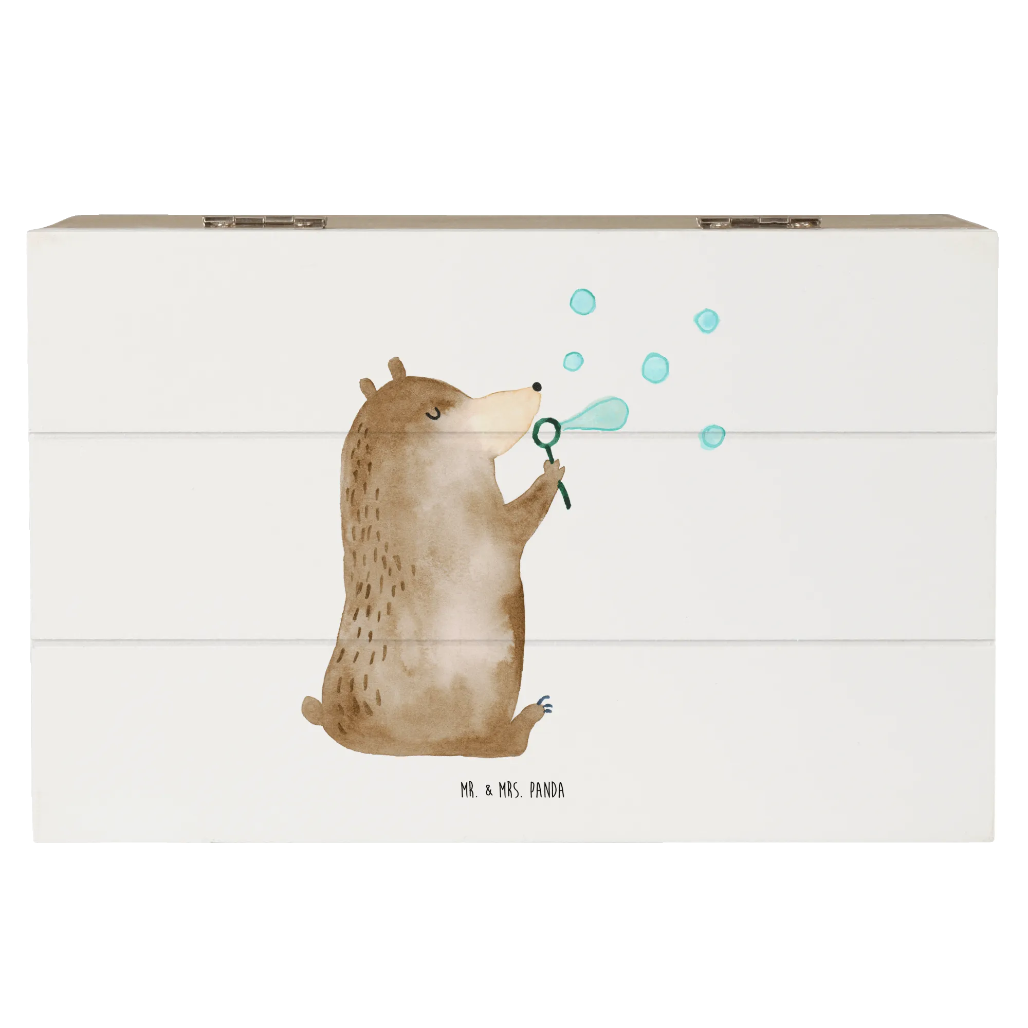 Die Holzkiste mit dem niedlichen Motiv des Bären mit Seifenblasen von Mr. & Mrs. Panda ist das perfekte Geschenk für jeden Anlass!