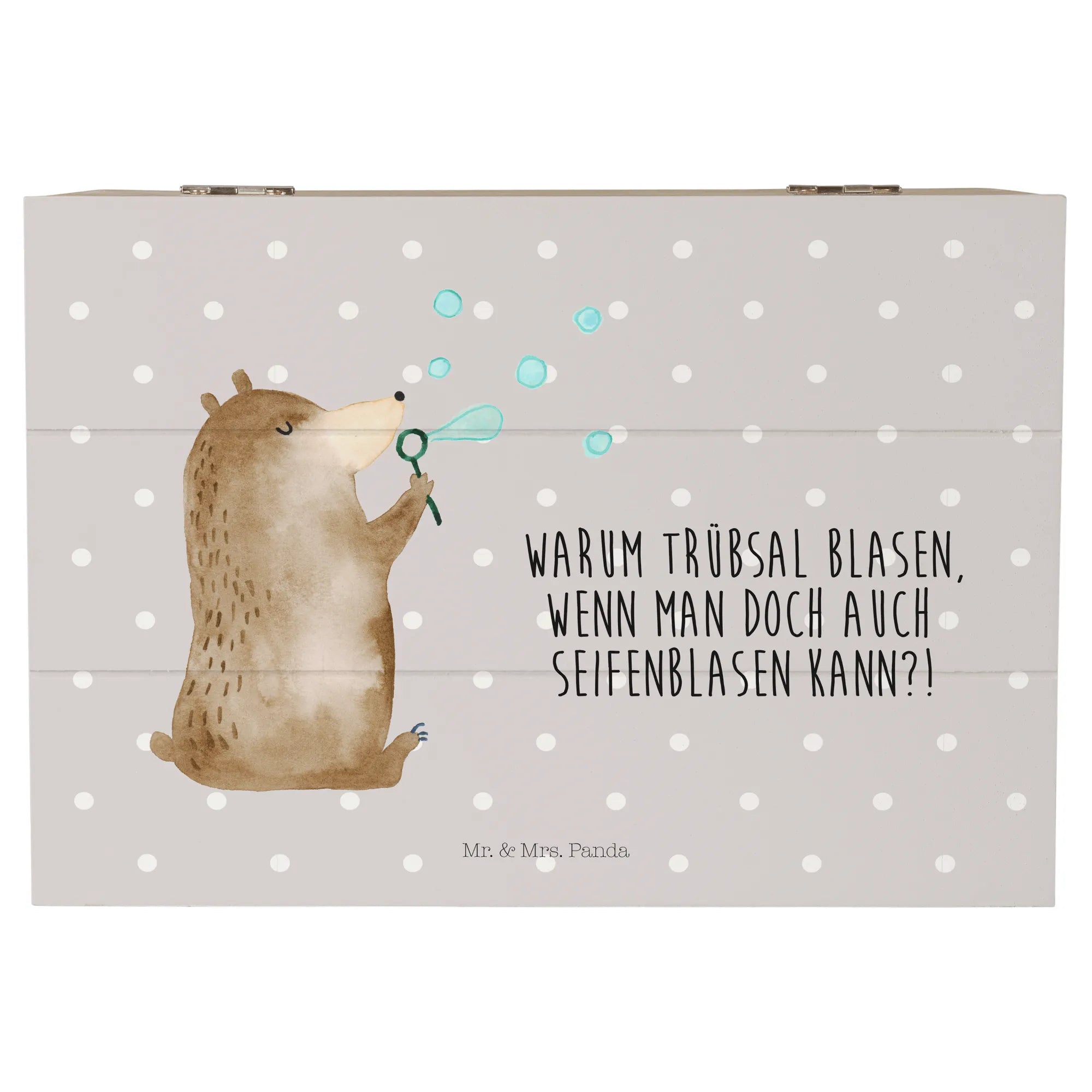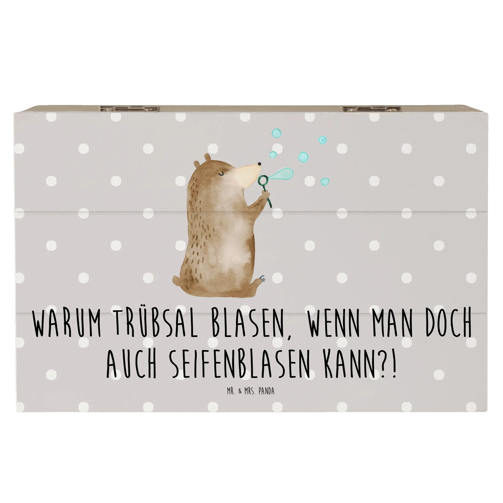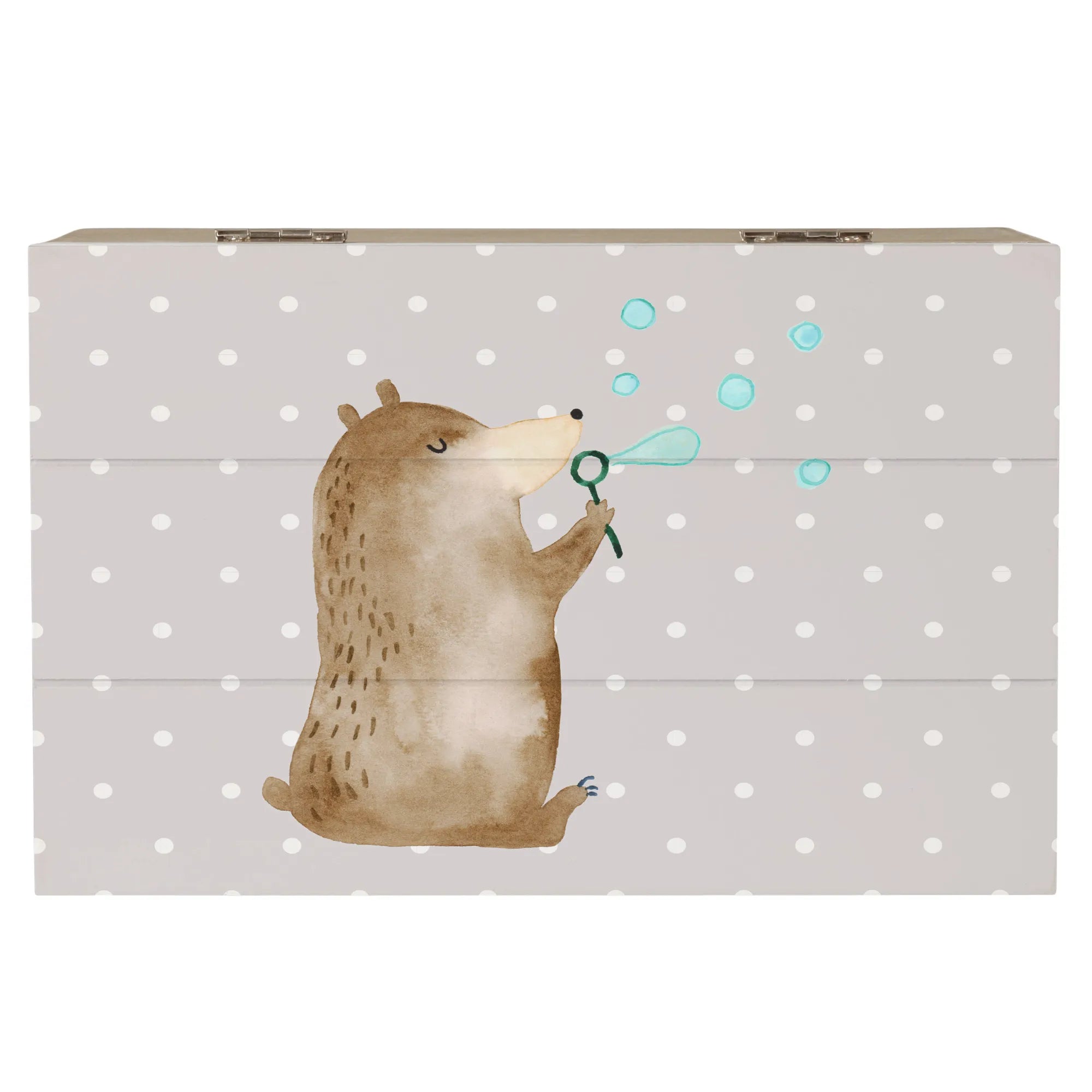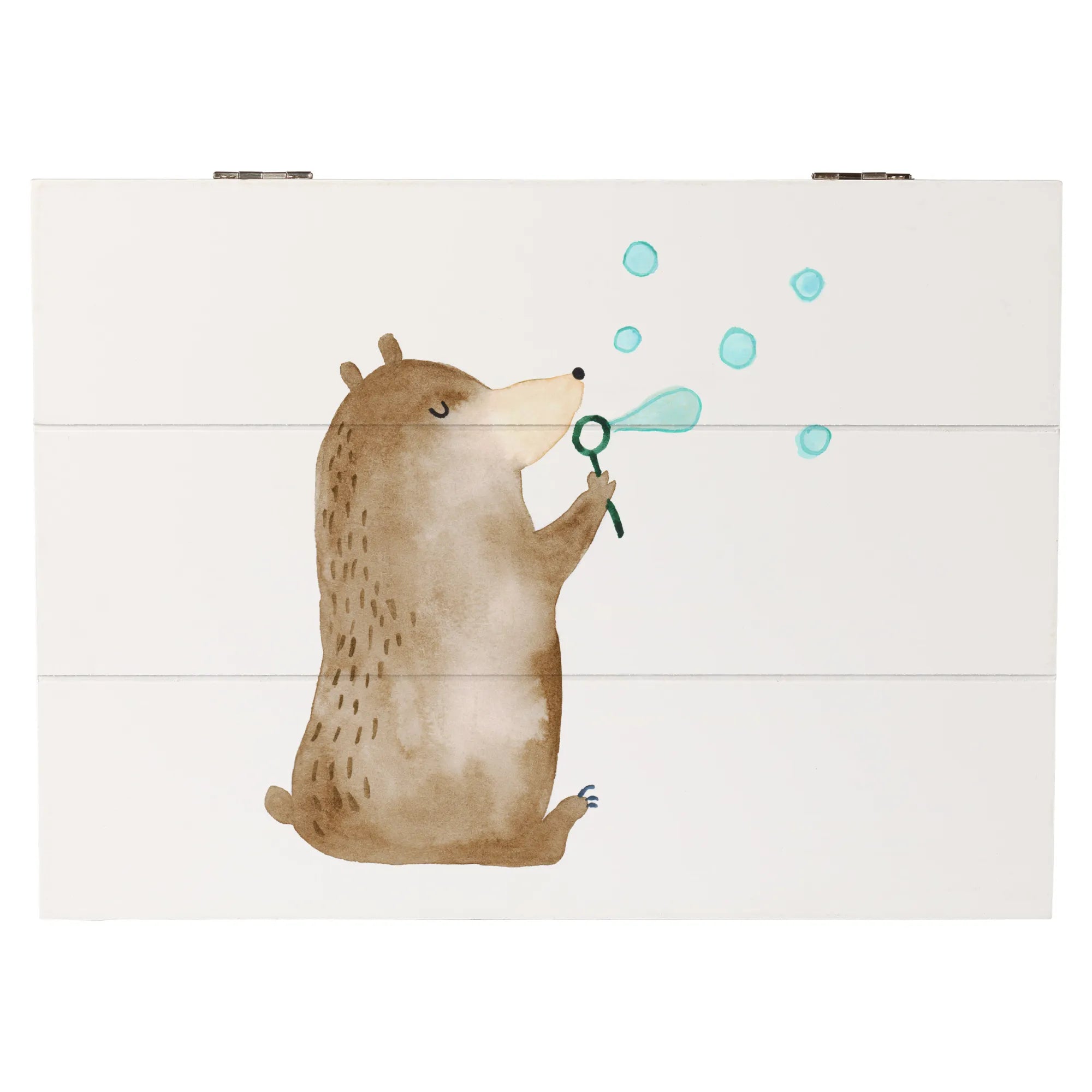 Die Holzkiste mit dem niedlichen Motiv des Bären mit Seifenblasen von Mr. & Mrs. Panda ist das perfekte Geschenk für jeden Anlass!