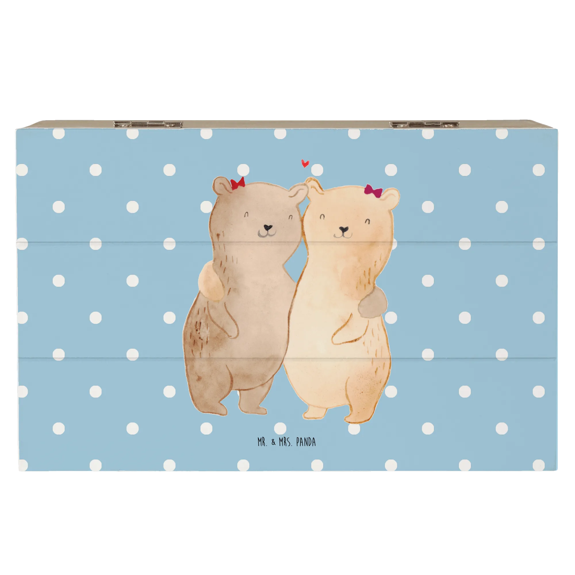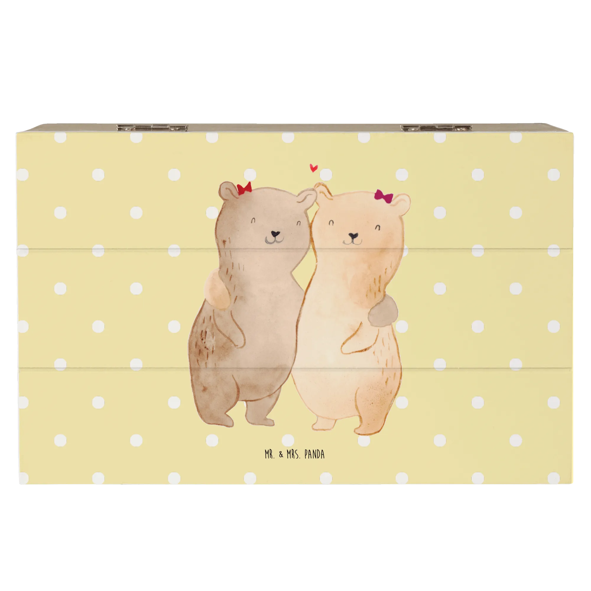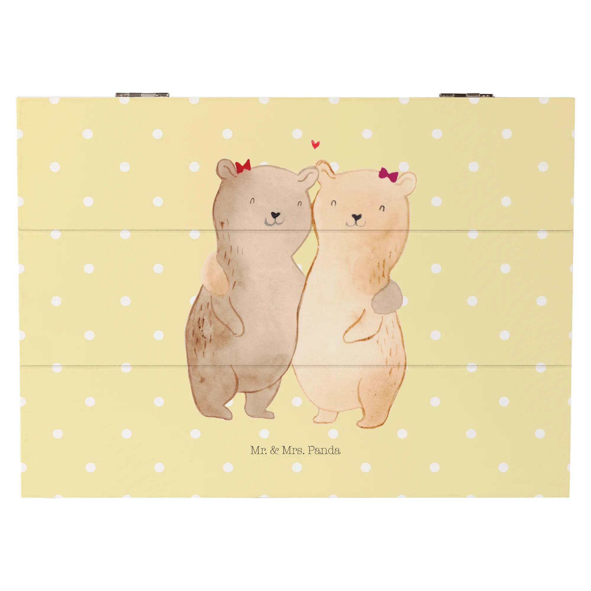 Die bezaubernde Holzkiste mit dem Motiv 'Bären Schwestern' von Mr. & Mrs. Panda ist nicht nur ein schmuckes Accessoire, sondern auch der perfekte Aufbewahrungsort für all deine kostbaren Erinnerungen! Ob als Erinnerungskiste für festliche Anlässe wie Kommunion oder Konfirmation, als Dekokiste für die Kinderzimmer, oder einfach als Schatzkiste für deine kleinen Schätze – diese Aufbewahrungsbox macht überall eine gute Figur!