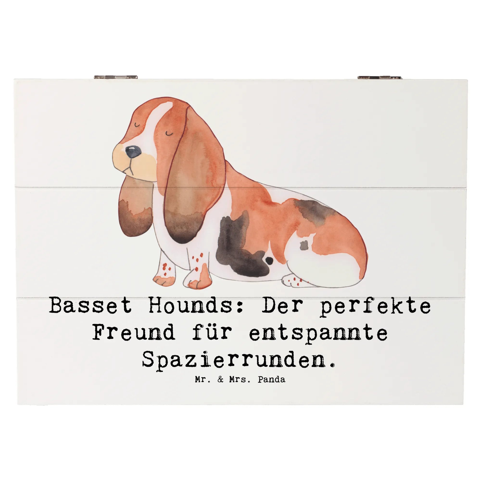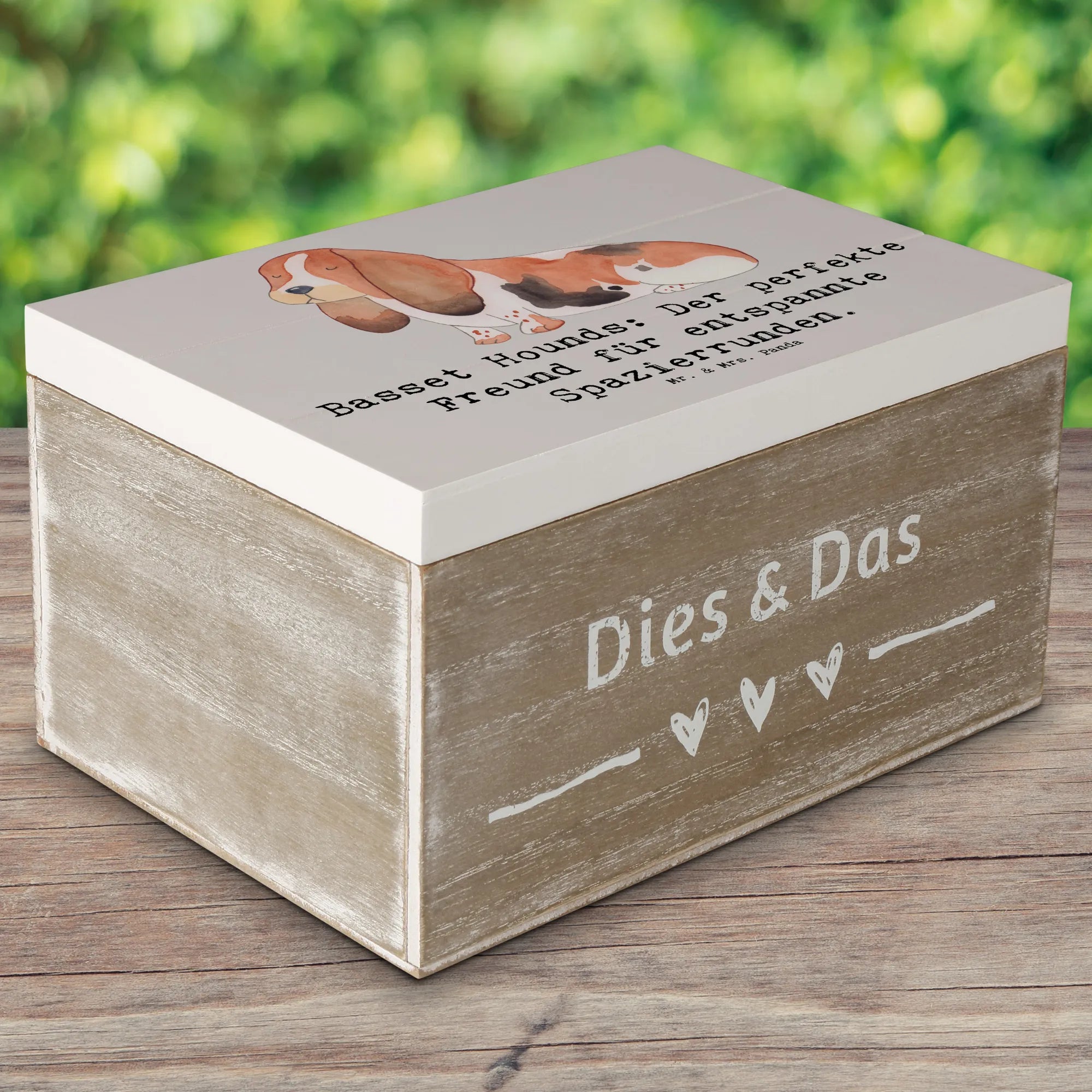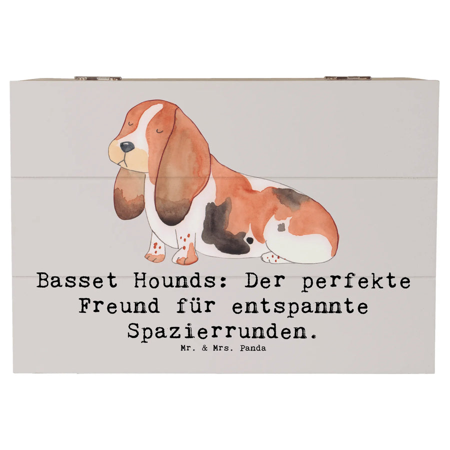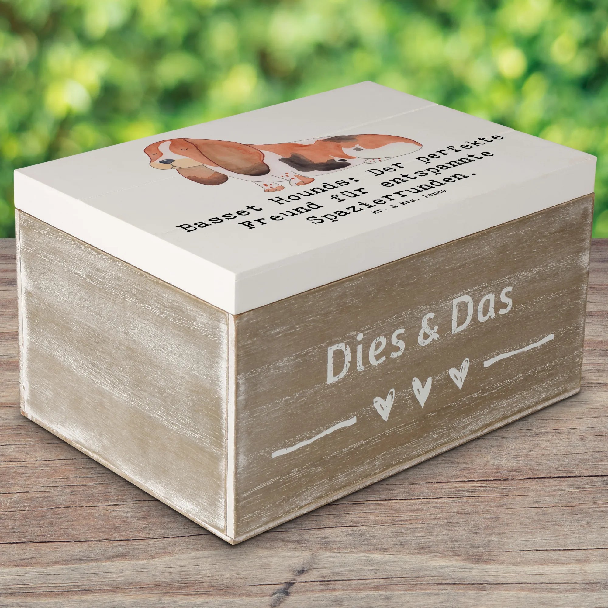 Diese beeindruckende Holzkiste von Mr. & Mrs. Panda begeistert nicht nur mit ihrem außergewöhnlichen Design, sondern auch mit ihrer Funktionalität. Mit einem bezaubernden Motiv des Basset Hound, das mit dem liebevollen Slogan "Basset Hounds: Der perfekte Freund für entspannte Spazierrunden" veredelt ist, wird diese Kiste schnell zum absoluten Highlight in deinem Zuhause.