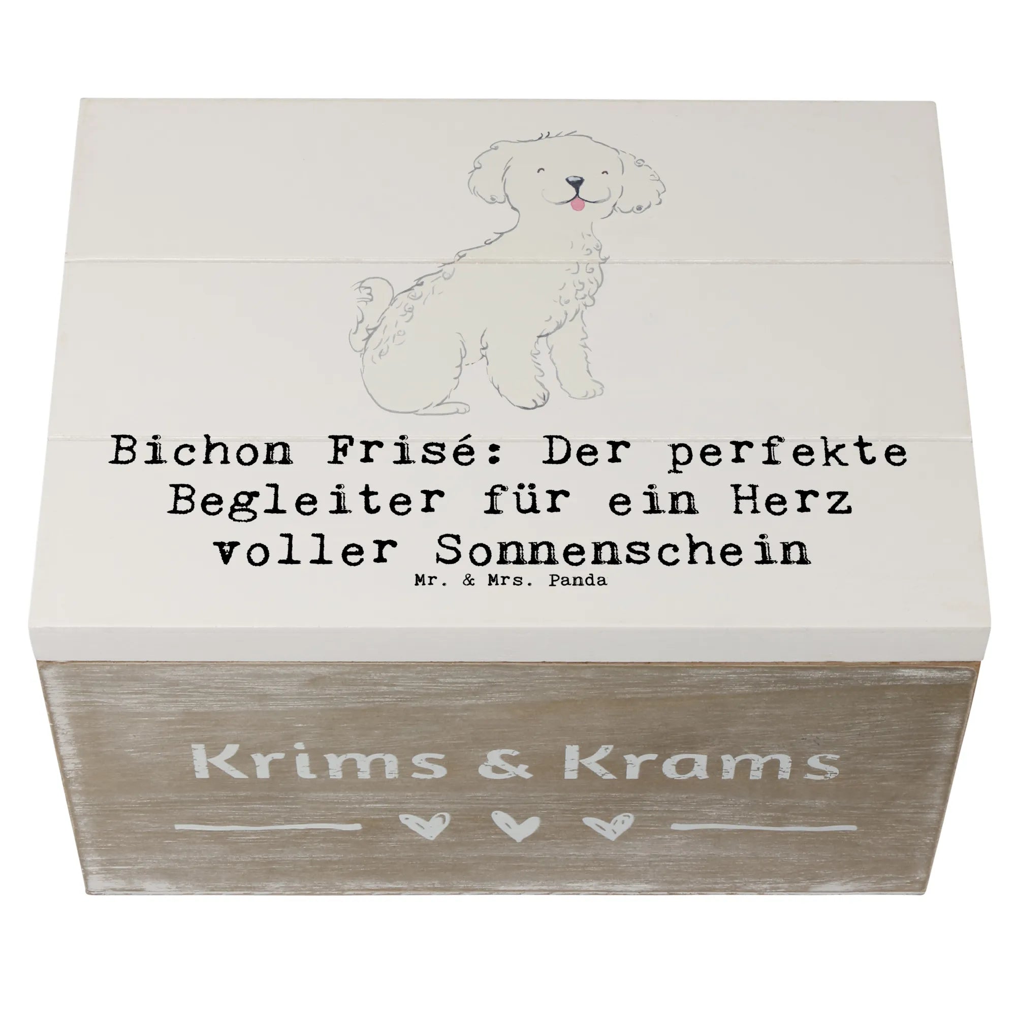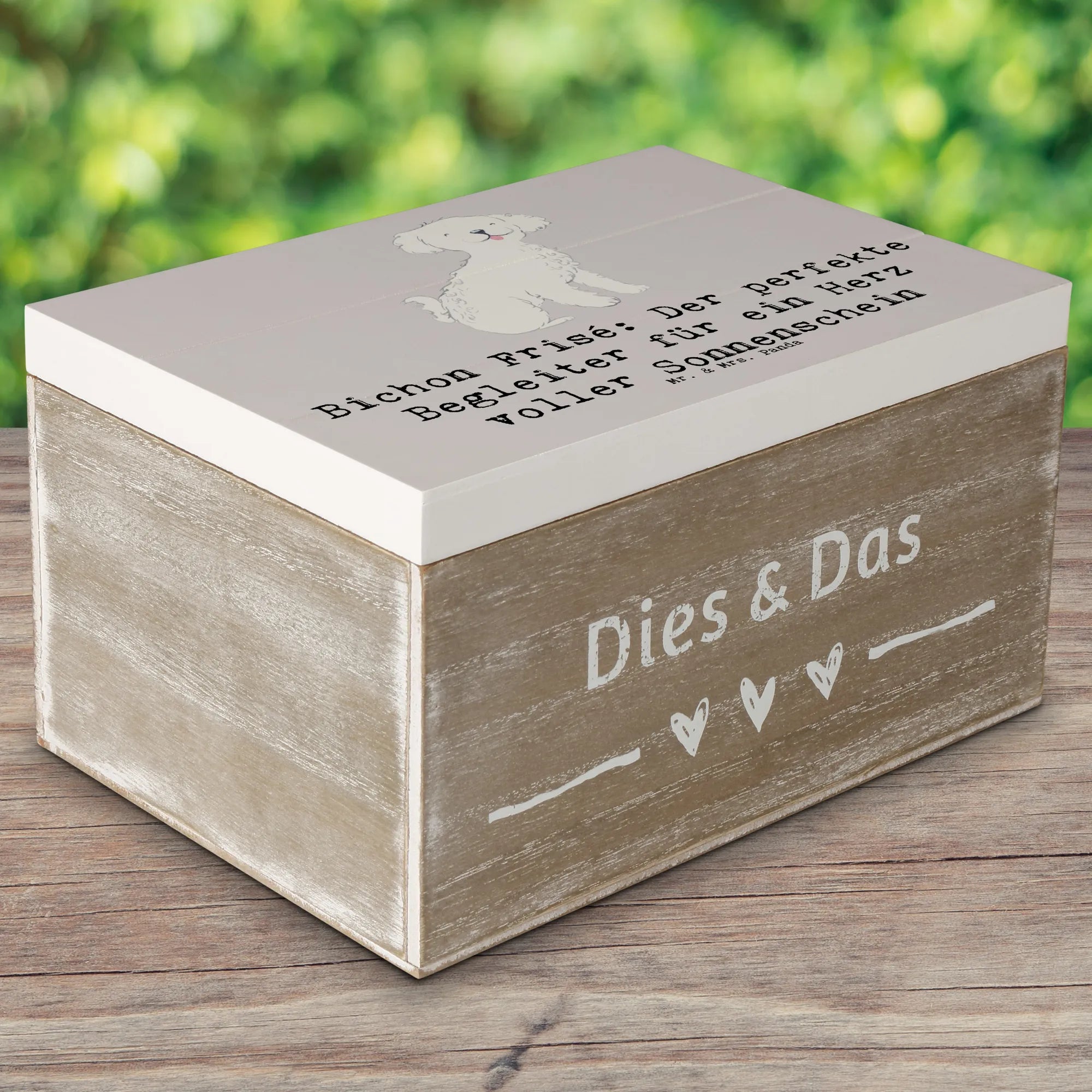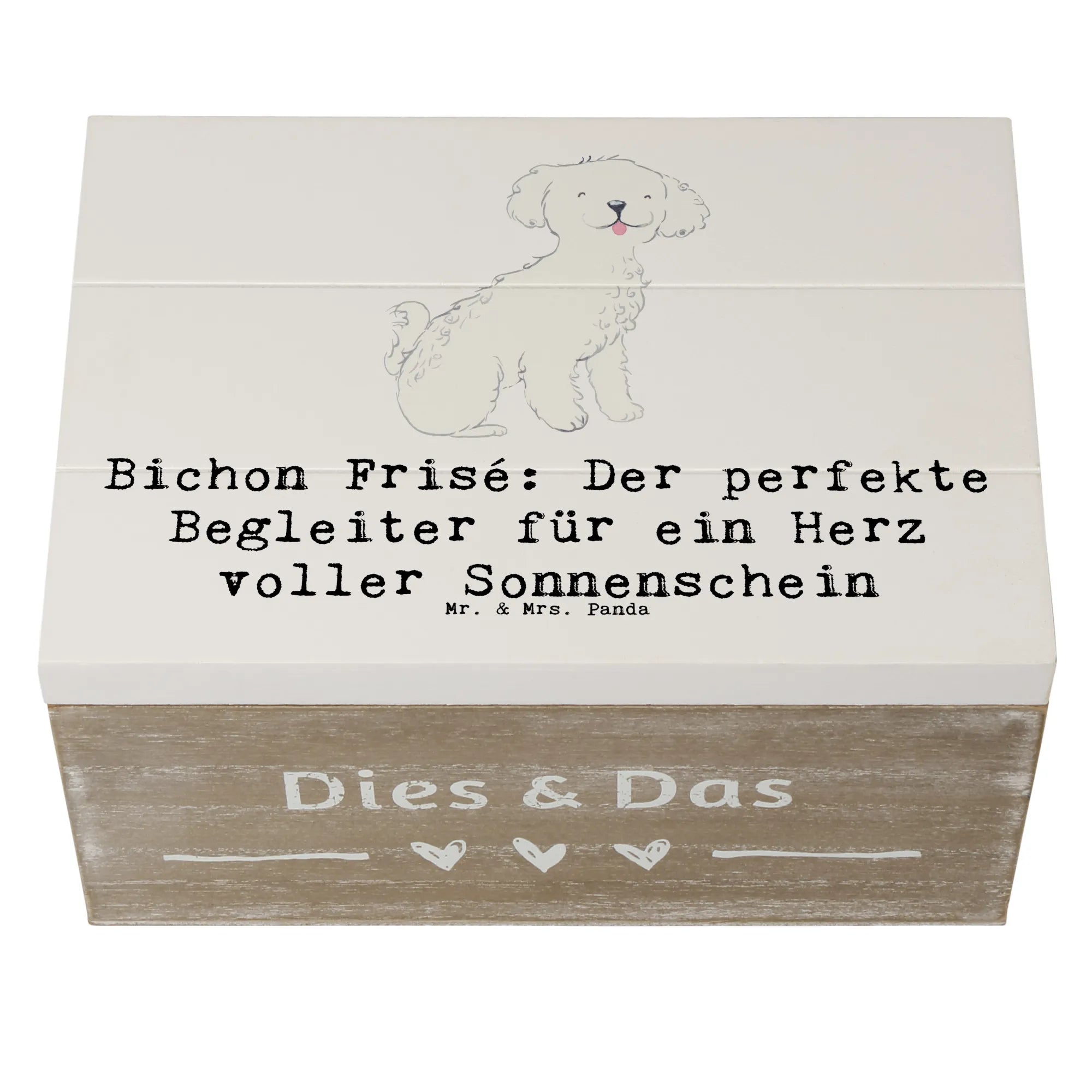 Die wunderschöne Holzkiste mit dem niedlichen Motiv "Bichon Frisé: Der perfekte Begleiter für ein Herz voller Sonnenschein" von Mr. & Mrs. Panda ist mehr als nur eine Kiste. Sie ist ein wahres Schatzkästchen für Hundefans! 🌟