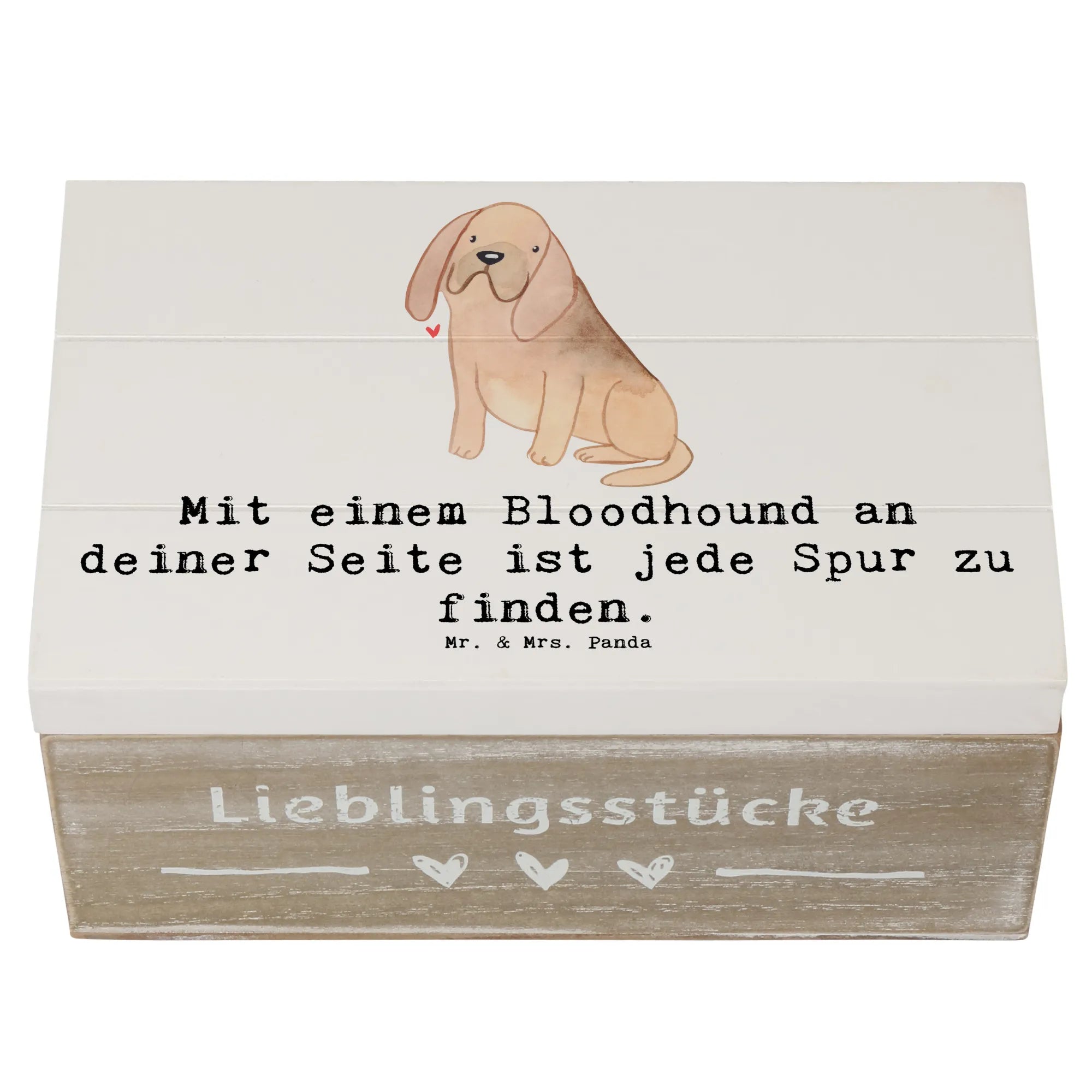 Entdecke die wundervolle Holzkiste mit dem süßen Bloodhound-Motiv aus der Hunderassen-Kollektion von Mr. & Mrs. Panda.
